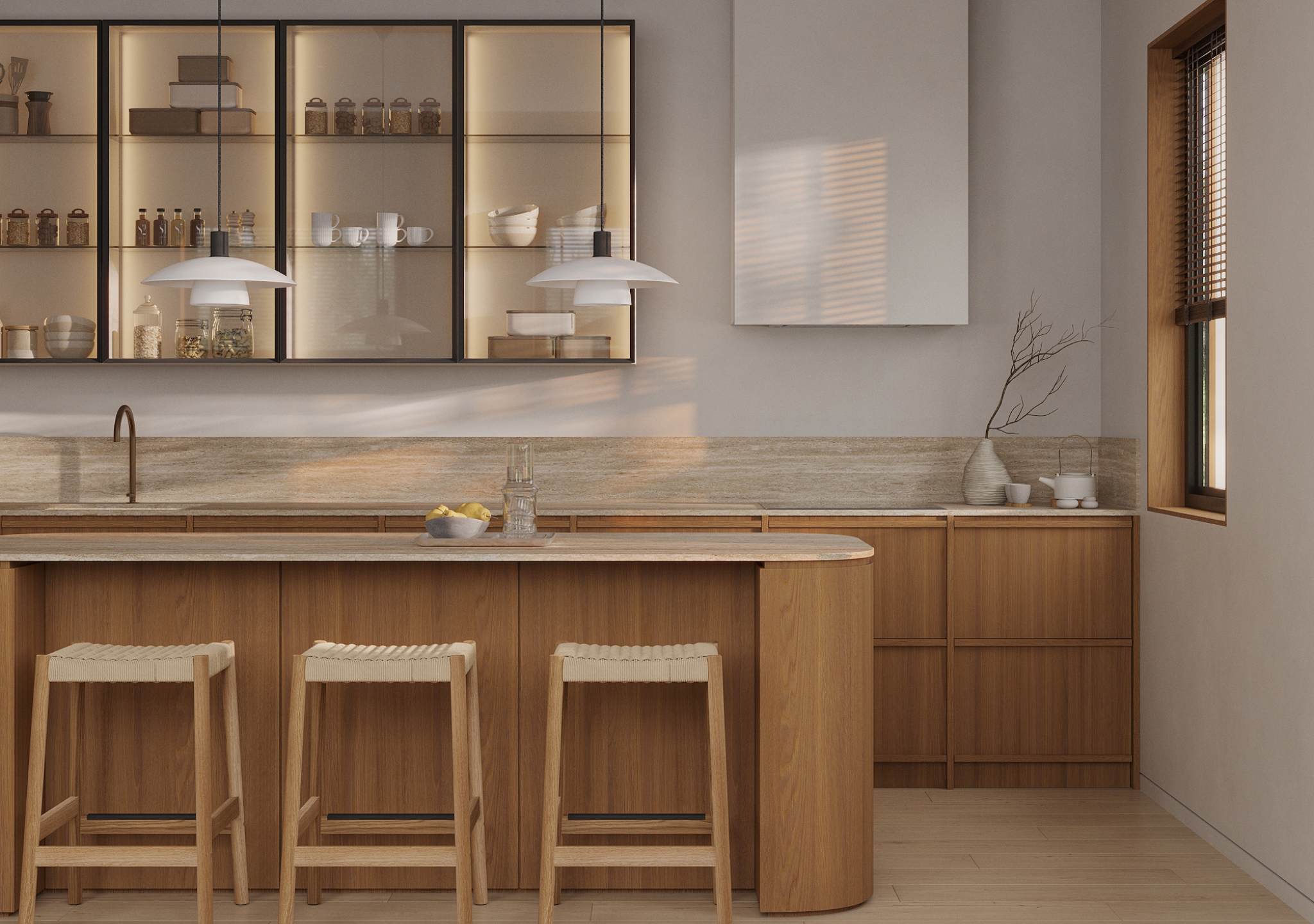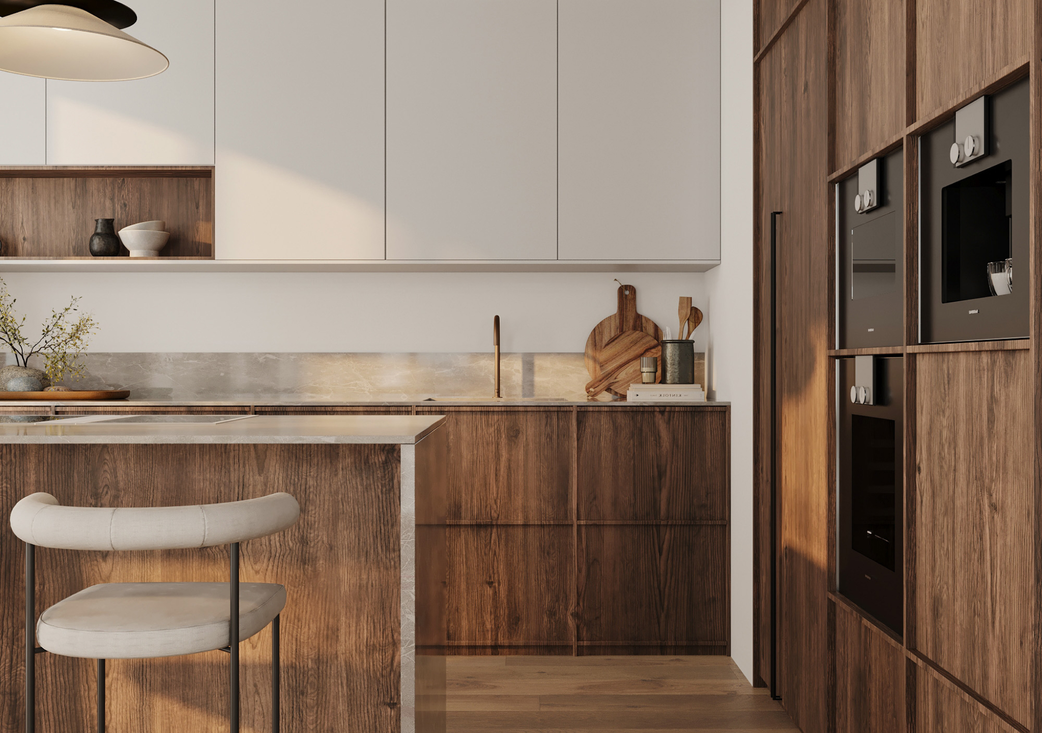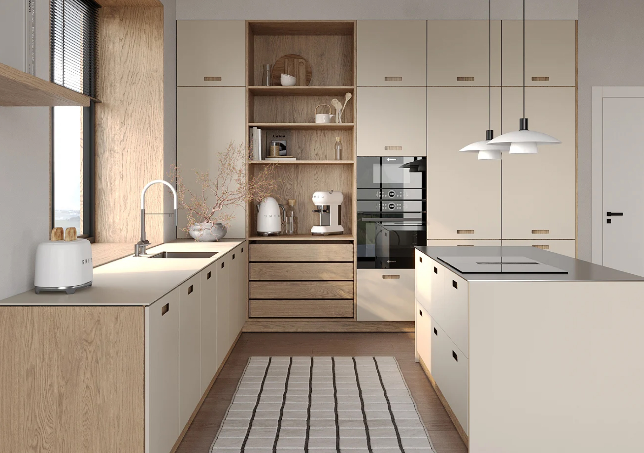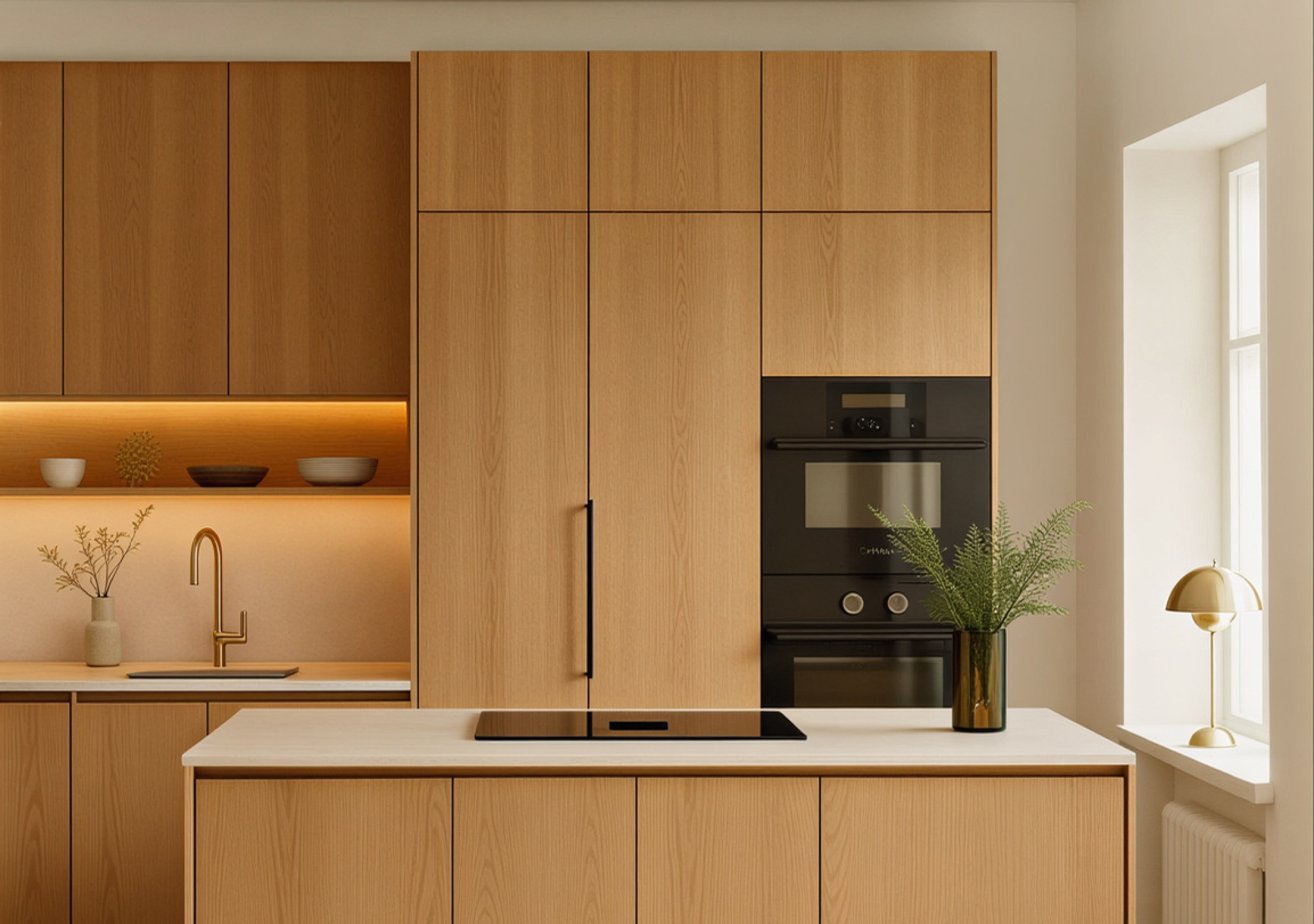 Oak, ash, stained oak, or walnut can all look Scandinavian when the tone, placement, and finish are controlled. This guide shows how wood affects brightness and “visual weight,” where to use each tone (bases, island, tall run), and how to pair it with calm whites, soft color, and quiet worktops so the kitchen stays effortless day to day.