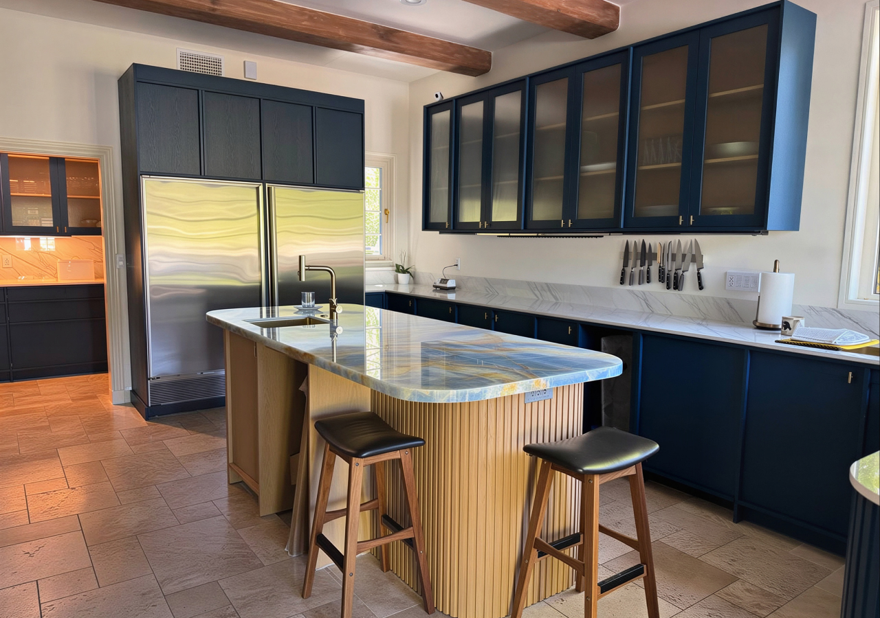 Japandi-inspired kitchen in Pacific Palisades shows the recipe with a bolder cabinet choice: deep navy cabinetry, sand-toned walls, and a fluted wood island that turns the dark into something calm and inviting.