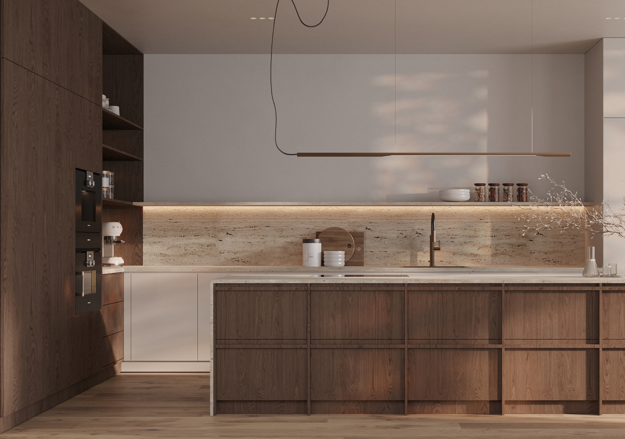 Element Air kitchen spells out the balance: dark wood cabinetry as an anchored foundation, a light matte backdrop to soften it, and under-cabinet LED strips that add a warm glow while improving function.