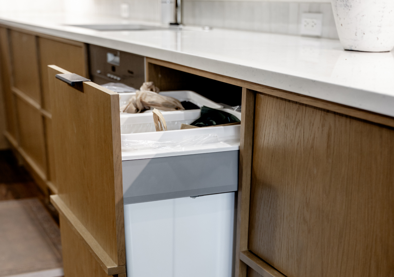 A good trash pull-out is less about “hiding the bin” and more about controlling mess at the source. When trash, recycling, and (optionally) compost live in one integrated cabinet near prep and sink zones, scraps and packaging don’t end up traveling across the kitchen, or sitting on the counter while you cook.