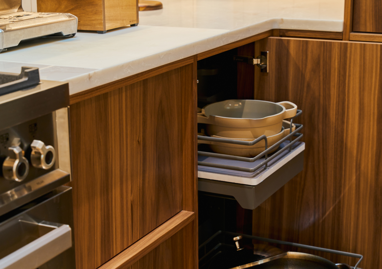 Corners are where organization breaks first: deep shelves, awkward reach, and items that disappear into the back. Corner pull-out solutions (Magic Corner-style systems, swing trays, or LeMans shelves) turn that dead space into reachable storage by bringing the contents out to you.