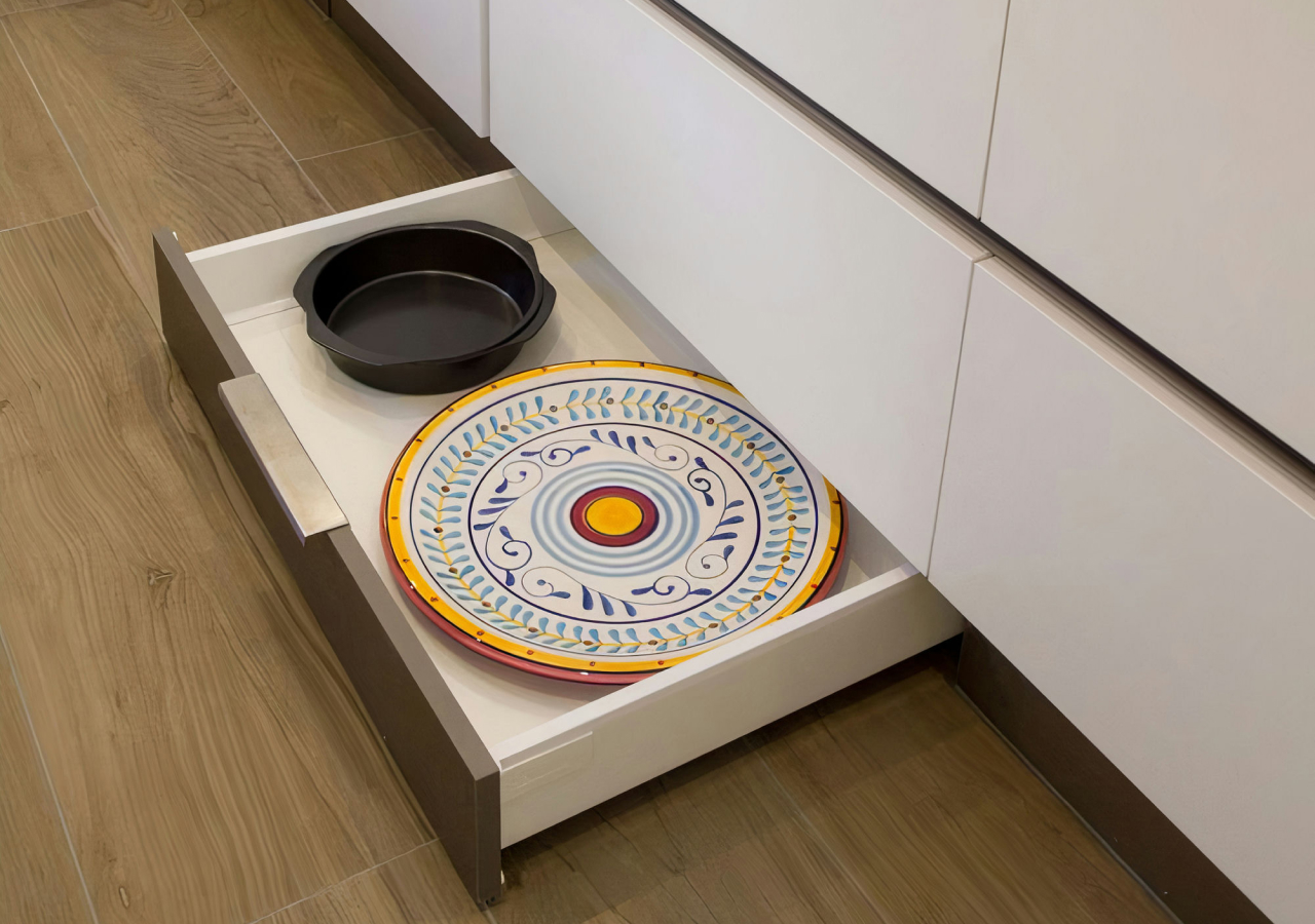 Toe-kick drawers (also called plinth drawers) add storage without adding visual bulk. They’re ideal for items you want nearby but not necessarily at hand every day, exactly the kind of “low priority but high value” category that tends to clutter cabinets when there’s no planned home.