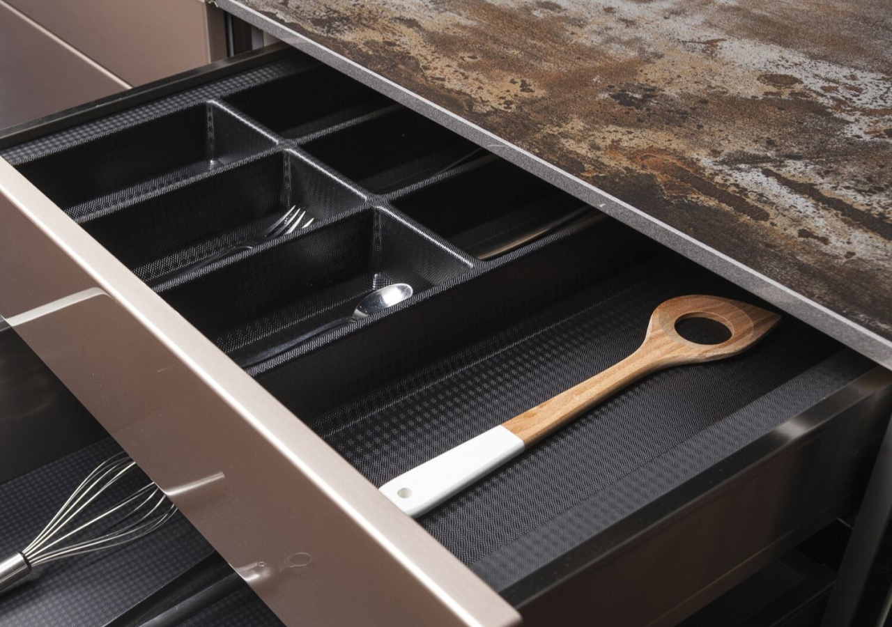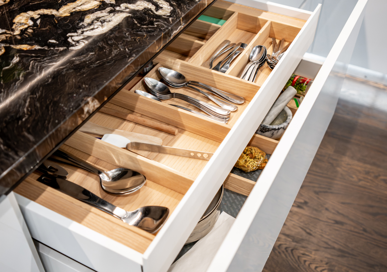 “Random drawers” happen when a drawer has no internal logic. Cutlery trays, dividers, and inserts turn that into a predictable system: utensils stay separated, tools don’t pile up, and you can reset the drawer in seconds after cooking.