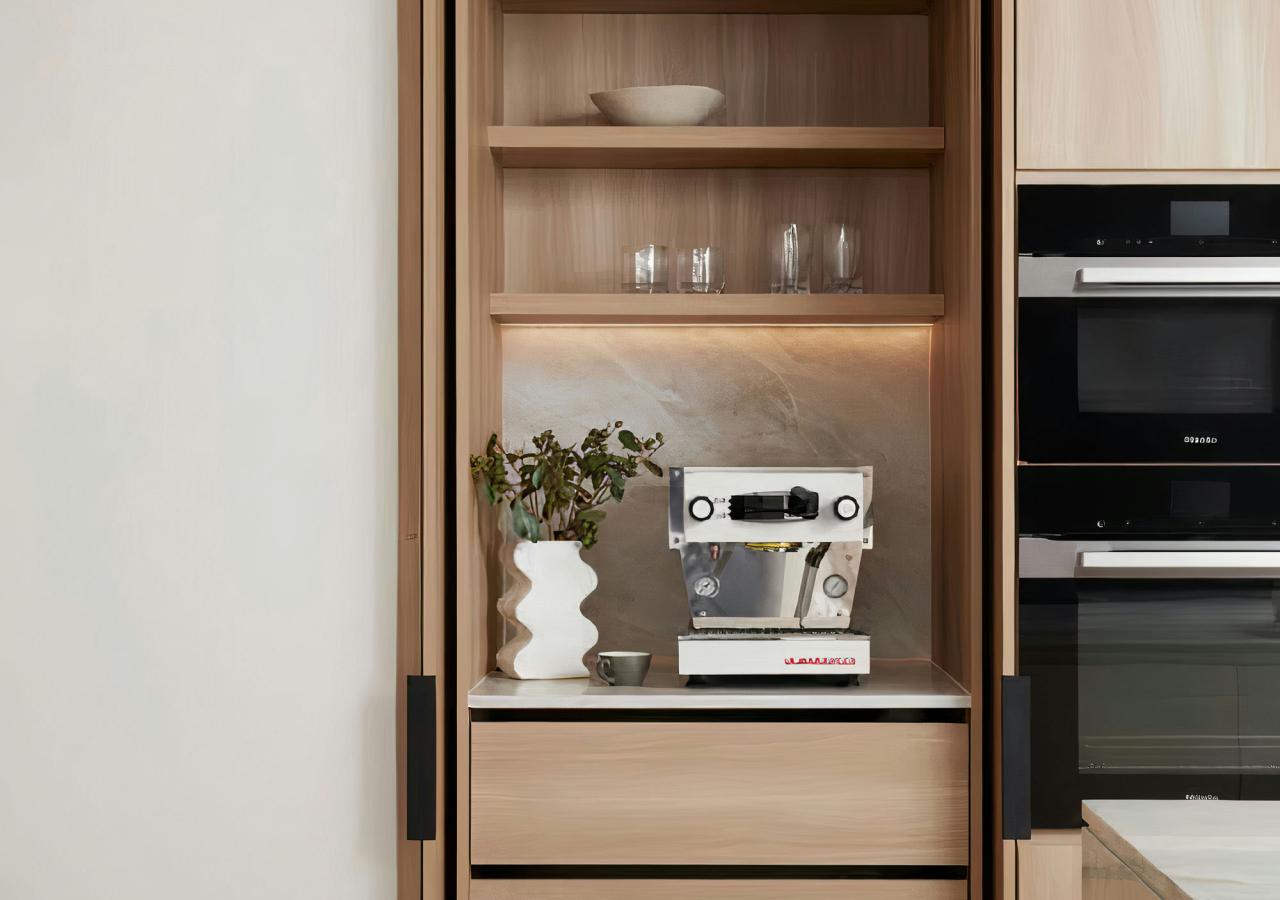 A coffee or tea station is a small closed zone that keeps the morning routine from taking over the countertop. Instead of leaving the machine, pods, mugs, sugar, and accessories out all day, you build a cabinet setup that opens when you use it and closes when you’re done.