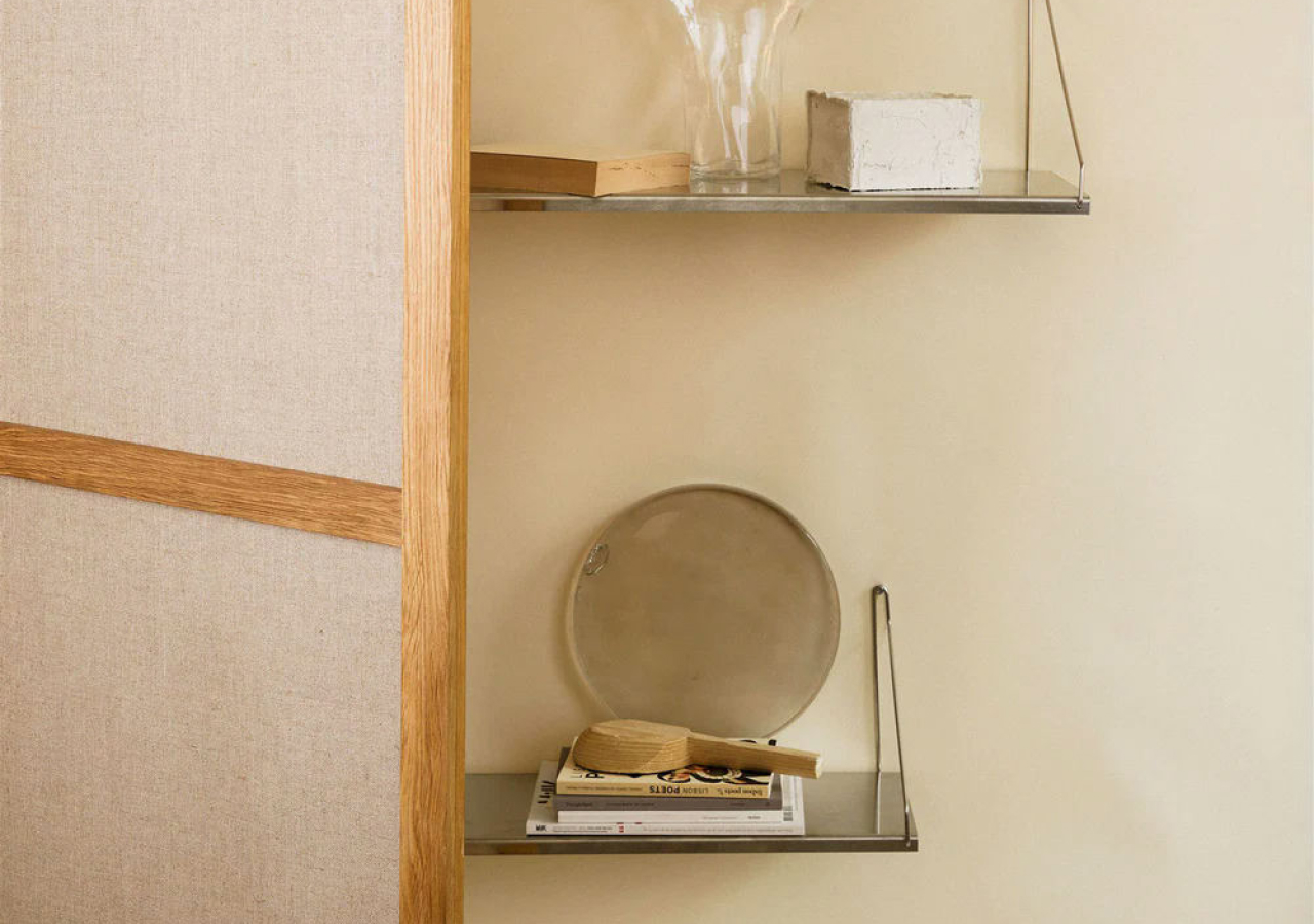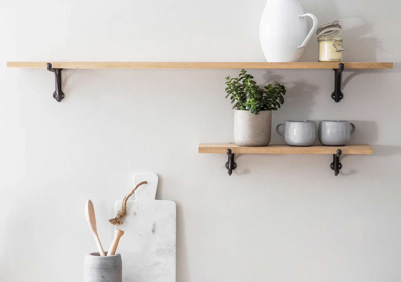 Visible brackets made of steel, painted wood, or powder-coated steel give shelves character and resemble furniture details. It is important to maintain a uniform distance between brackets and align them with the lines of the seams or joints of the cabinets to achieve a harmonious and thoughtful look.