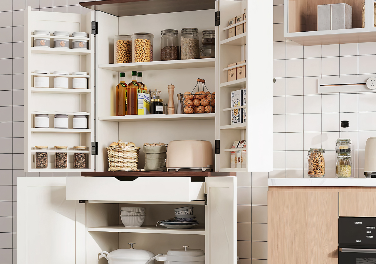 Several drawers or baskets help keep small items organized, and clearly marked zones make it easier to access and maintain order. This approach increases usable storage space, speeds up restocking, and makes the kitchen more convenient for everyday use, while creating a sense of order and simplicity.