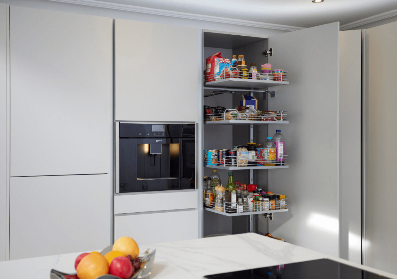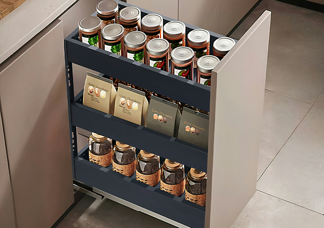 Pull-out shelves help hide items while making them easily accessible. They slide forward, allowing you to see all jars and containers at once. Narrower shelves are convenient to place next to the stove for oils and sauces, while deep trays can be used to store food at a medium height.