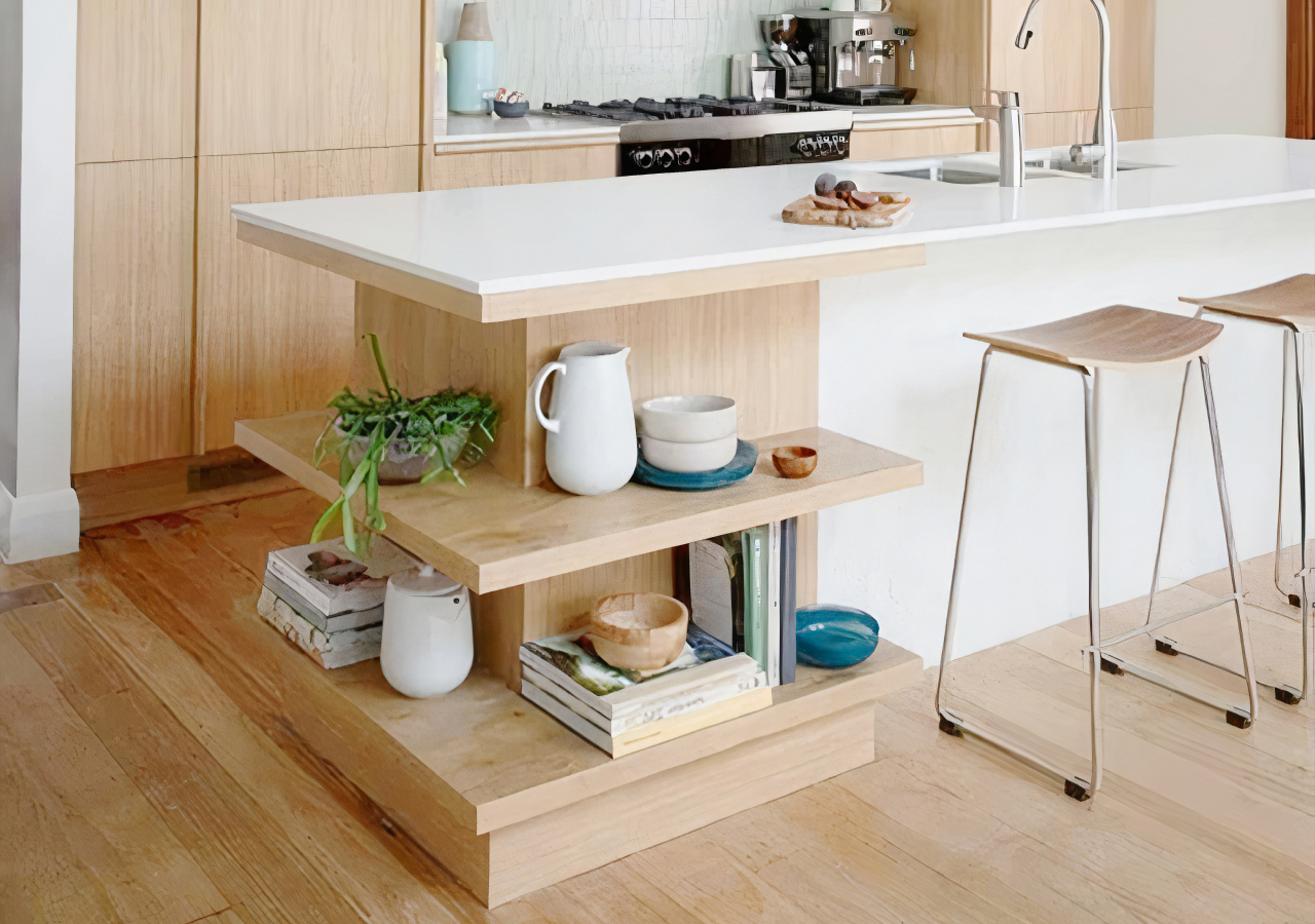 Shallow shelves on the kitchen island's seating side are perfect for storing bowls, trays, or cookbooks—items that are both beautiful and in demand every day. To maintain harmony and functionality, combine open shelves with deep pull-out drawers on the work area side.
