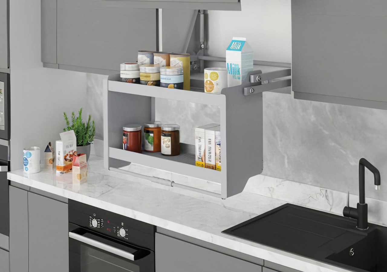 It is recommended to store medium-weight items used weekly on pull-out shelves, and heavier items at shoulder level or lower. It improves the ergonomics of the kitchen and makes everyday use more comfortable, reducing the risk of items falling and saving time when cooking and cleaning.