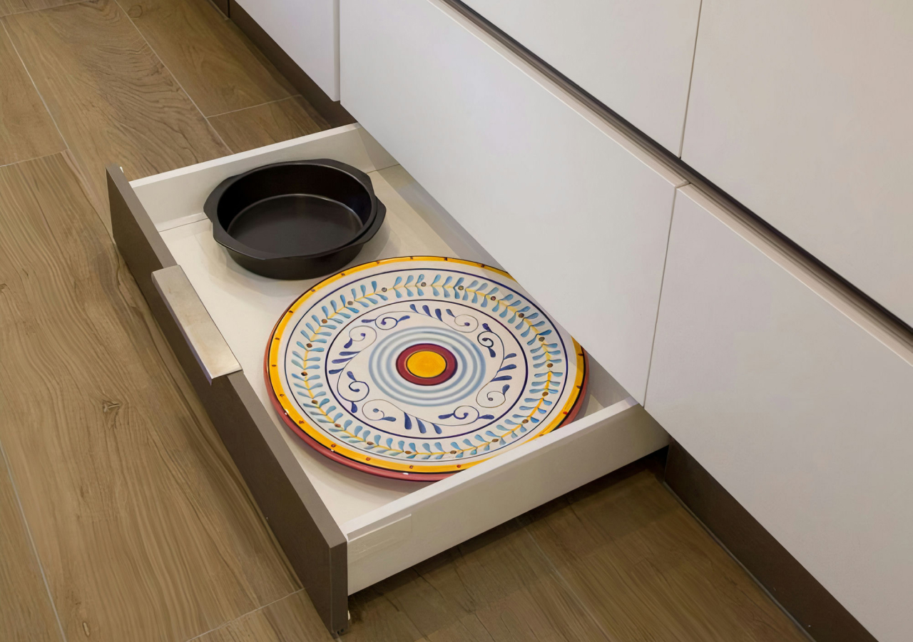 Often overlooked, the space beneath cabinets can be utilized with toe-kick drawers. These shallow drawers are perfect for flat items like trays or baking sheets. They maximize every inch of cabinetry and turn unused space into functional storage. For families, they also make it easier for children to access lightweight kitchen items.