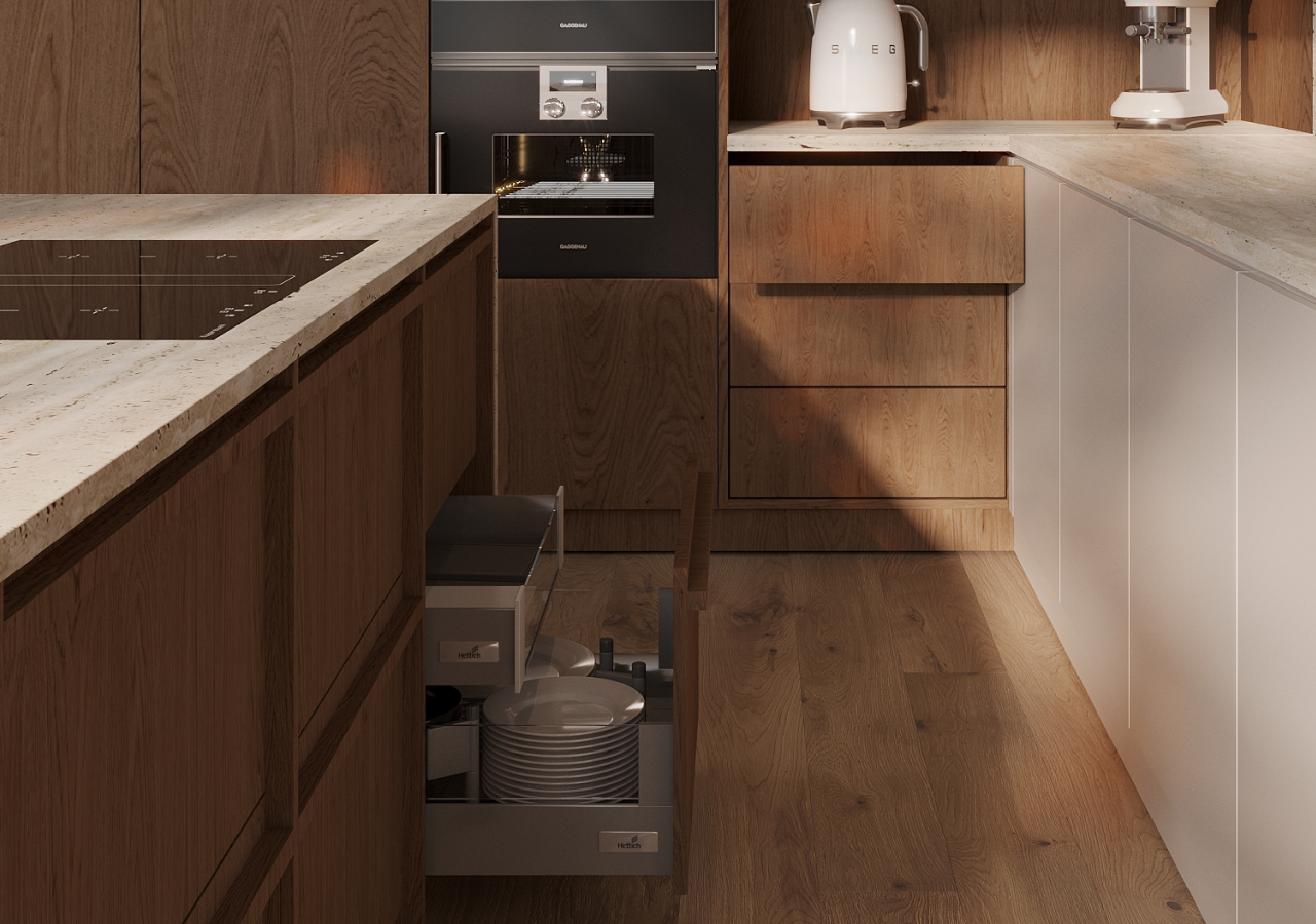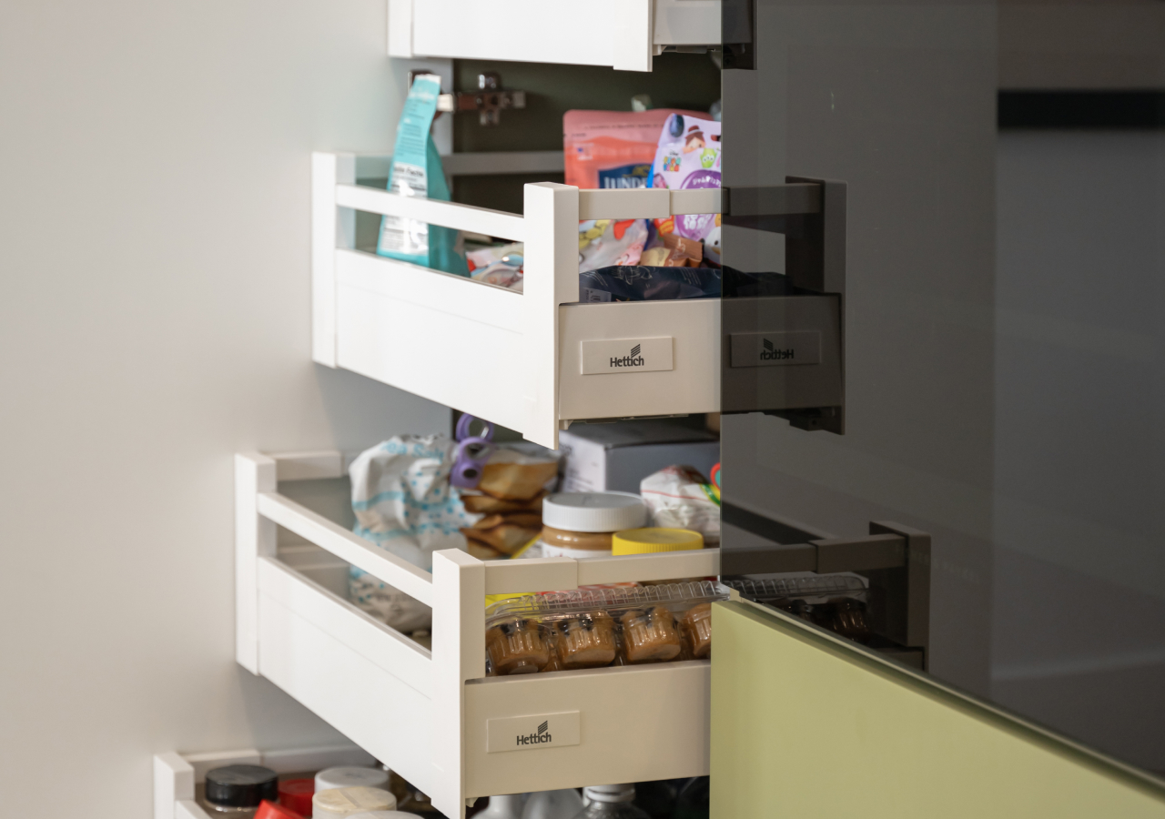 Shelf-lock drawers blend the stability of shelving with the flexibility of drawers. They are particularly good for storing heavy items like appliances or cookware, preventing shifting and ensuring safe access. With modern soft-close hardware, they offer a durable and smooth experience.