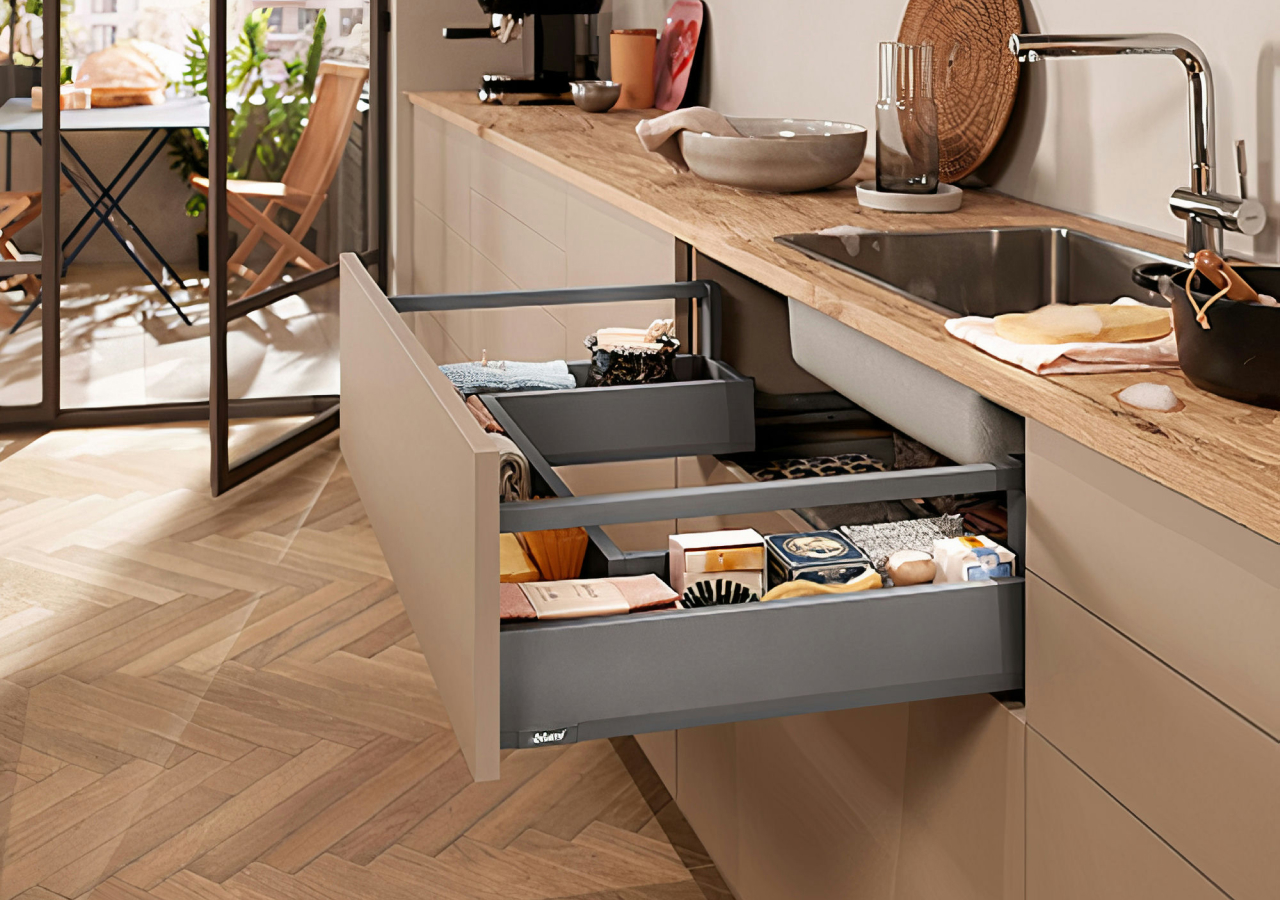 The area beneath the sink is often underused, but with a fitted under-sink drawer, it becomes effective storage. Designed around plumbing, these drawers keep cleaning supplies and essentials organized. This transforms an awkward space into one of the most efficient parts of the kitchen.