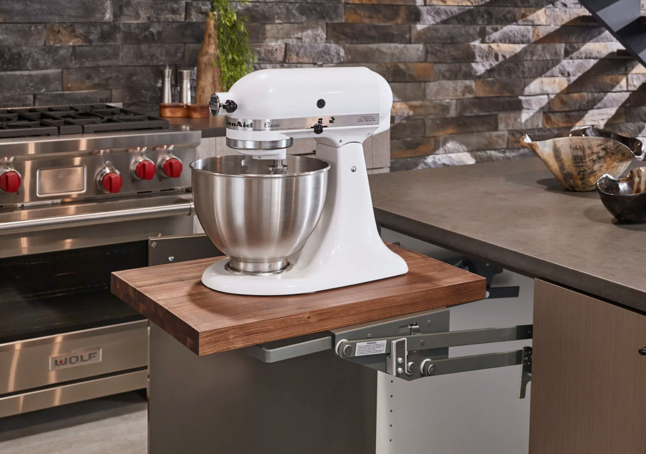 For heavy appliances like stand mixers, lift-up shelves offer a smart solution. Hidden within base cabinets, these shelves rise to counter height with ease, reducing strain and keeping bulky items out of sight when not in use. This storage feature combines safety, convenience, and style.
