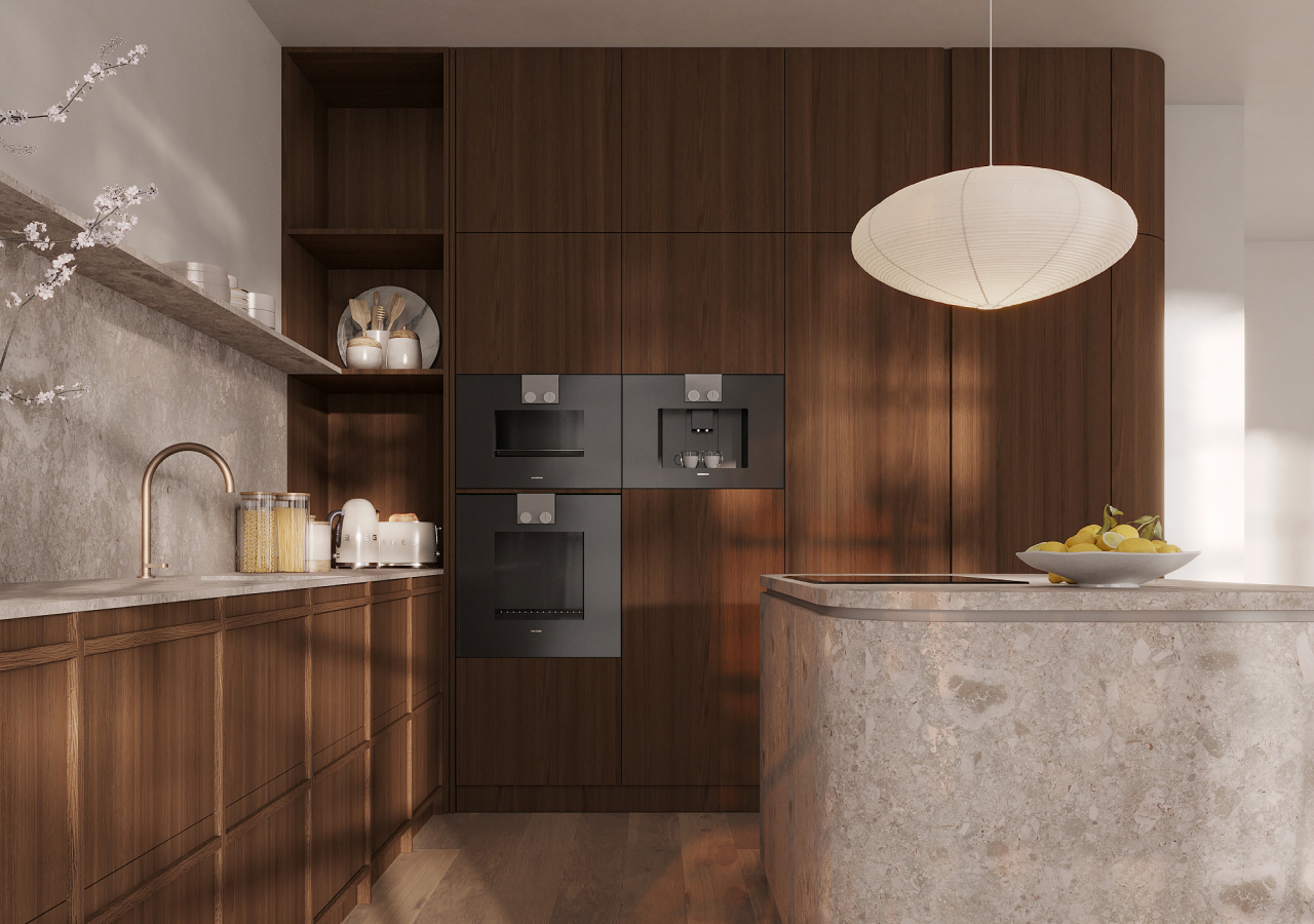 A kitchen can look “busy” when daily items have nowhere to go. Curves don’t solve storage by themselves, yet they work well alongside the kind of integrated planning: handleless fronts, built-in appliances, and functional internal storage that protects counters from clutter.