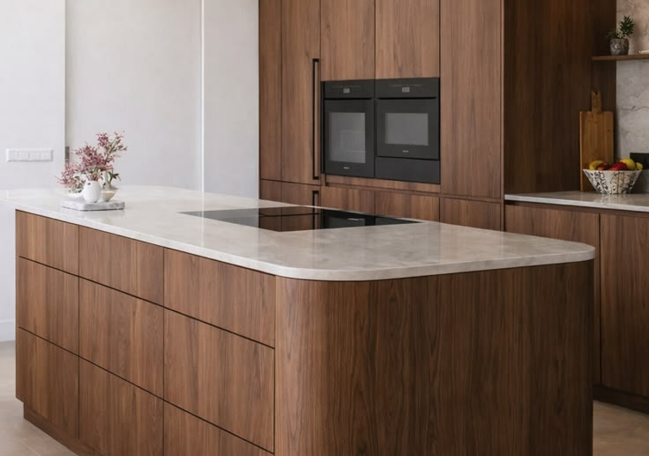Comfort matters here, too. Rounded stone edges feel less harsh at the seating line and tend to wear better in busy kitchens where corners take knocks. The key is coordination: curved stone needs early decisions on templating, seam placement, and support so the curve looks clean and deliberate when installed. If your island is already doing a lot (storage, appliances, seating), this is the moment where “design” and “build” have to agree.