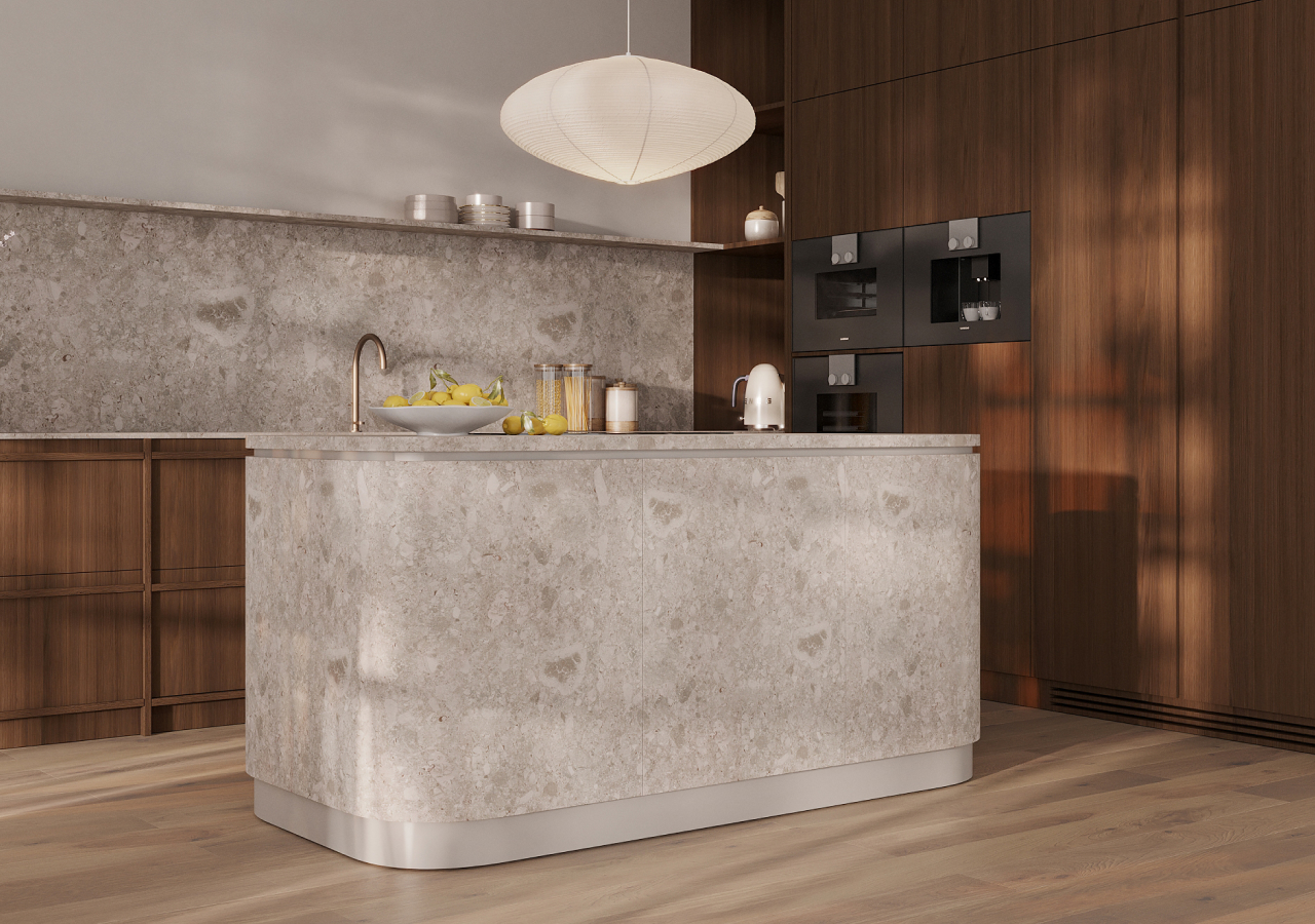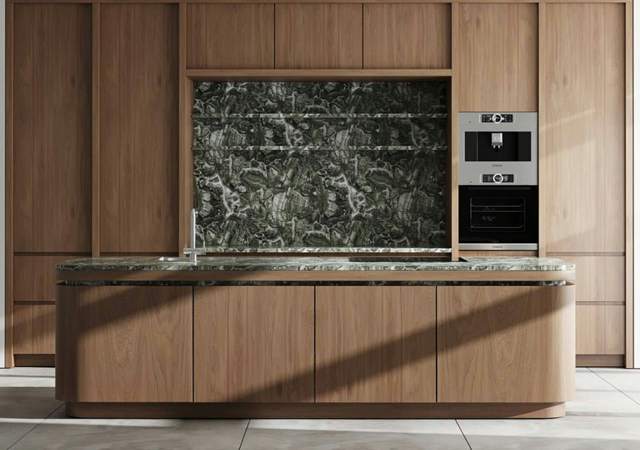 A curved stone overhang brings a more architectural feel to the island while supporting the broader move toward calmer, more continuous surfaces. When the shape carries the visual interest, the material can stay quieter and still feel elevated. A thicker overhang also defines seating clearly and adds a sense of weight and permanence that suits modern kitchens with matte cabinetry and natural wood tones.