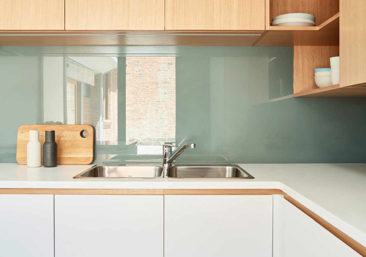 The best versions are usually simple in color. Warm white, pale gray, taupe, or soft beige tend to work better than bold tones because they reflect light without overpowering the rest of the kitchen. Glass is also practical: it is non-porous, stain-resistant, and easy to wipe down after daily use.