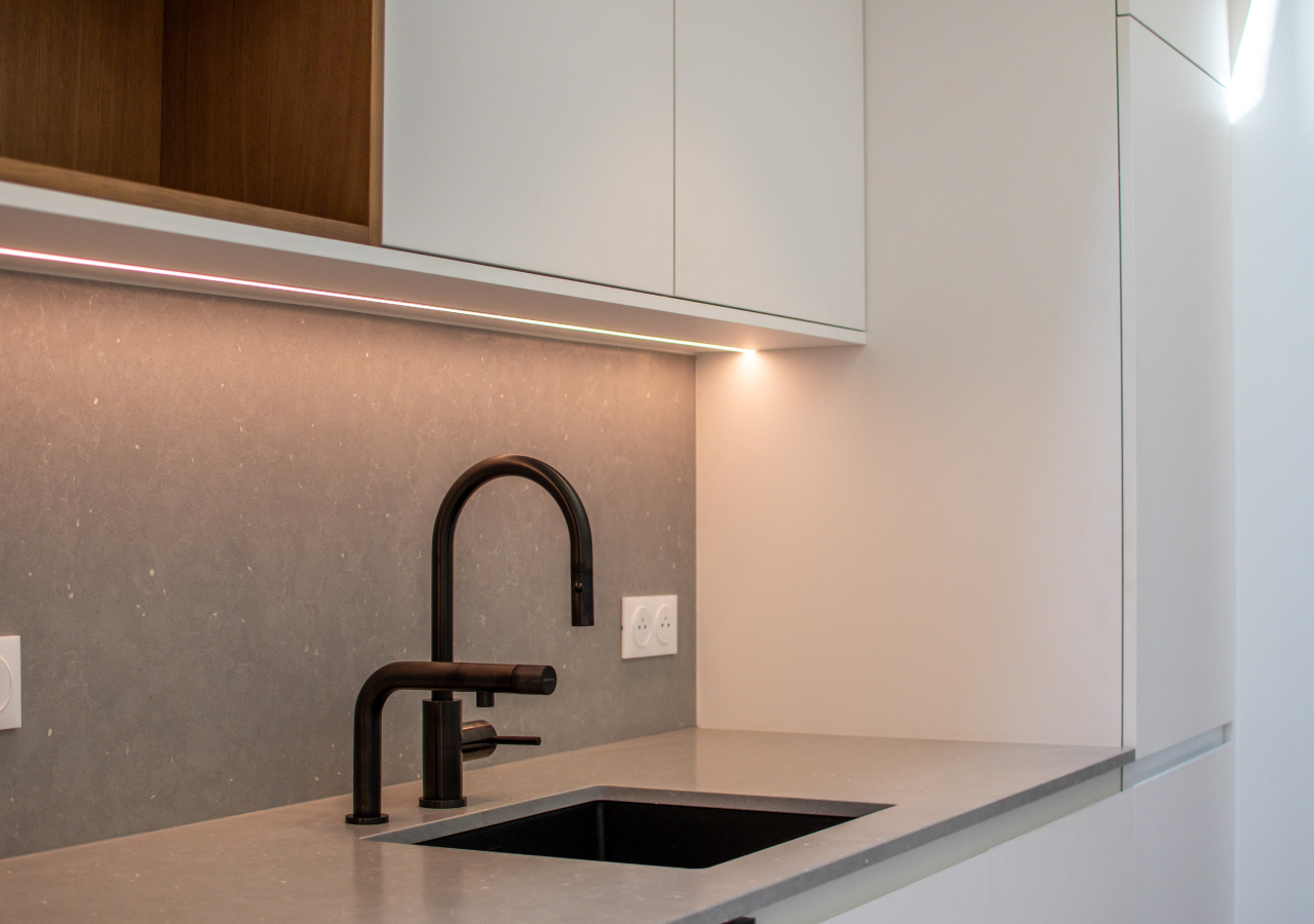 This creates a particularly clean effect in low-splash areas, coffee stations, breakfast zones, or kitchens where the cooktop wall is handled separately in a more heat-resistant material. The result is visually minimal and highly integrated.