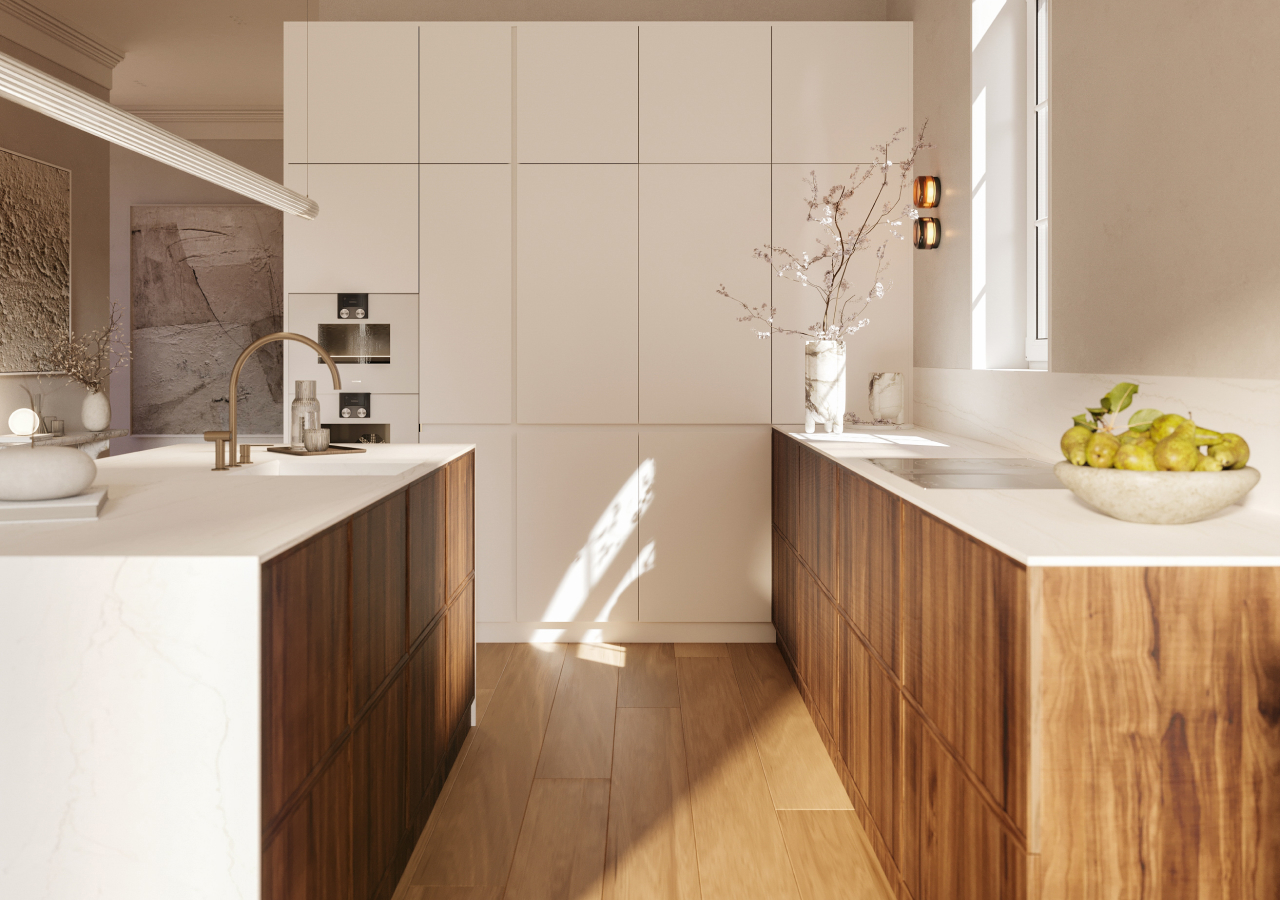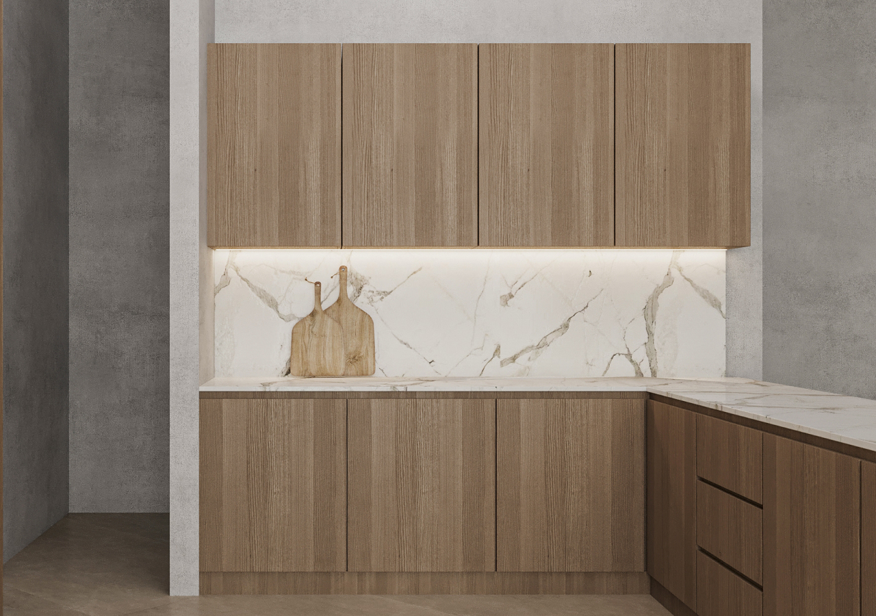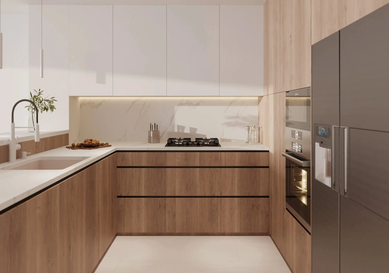Flat slab fronts are the classic modern-European baseline, but they don’t have to feel sterile. The warmth usually comes from finish and texture: a matte surface instead of gloss, wood veneer in the right places, or a subtle textured laminate that adds depth without introducing busy detail. If you prefer something softer than slab, a slim shaker can still read European as long as the proportions stay minimal and the overall grid remains clean.