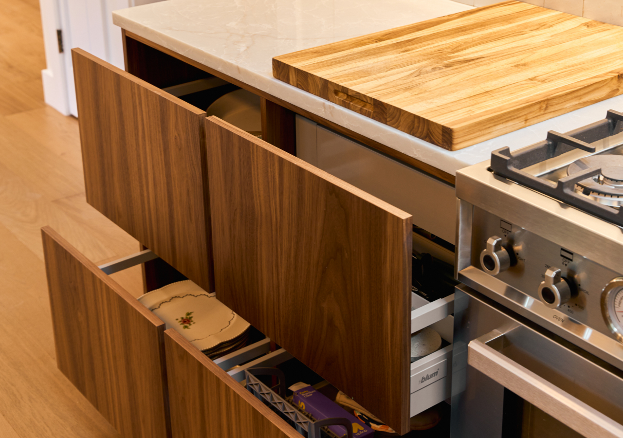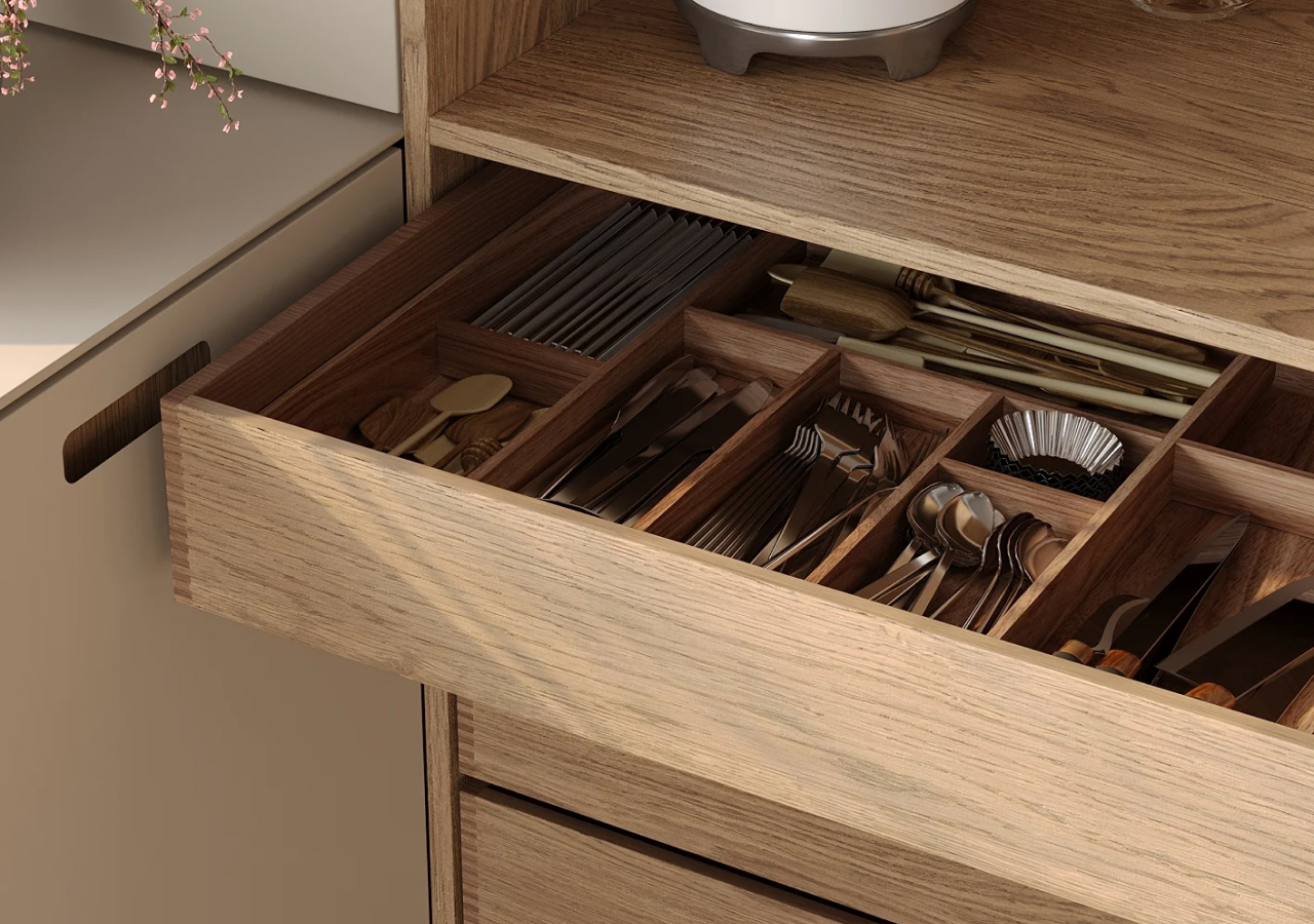 Inner drawers are one of the most European-feeling upgrades because they keep the exterior seamless while adding a second layer inside. They’re especially good for small tools, cutlery, spices, and prep accessories—anything you want organized and visible, but not living out on the countertop.