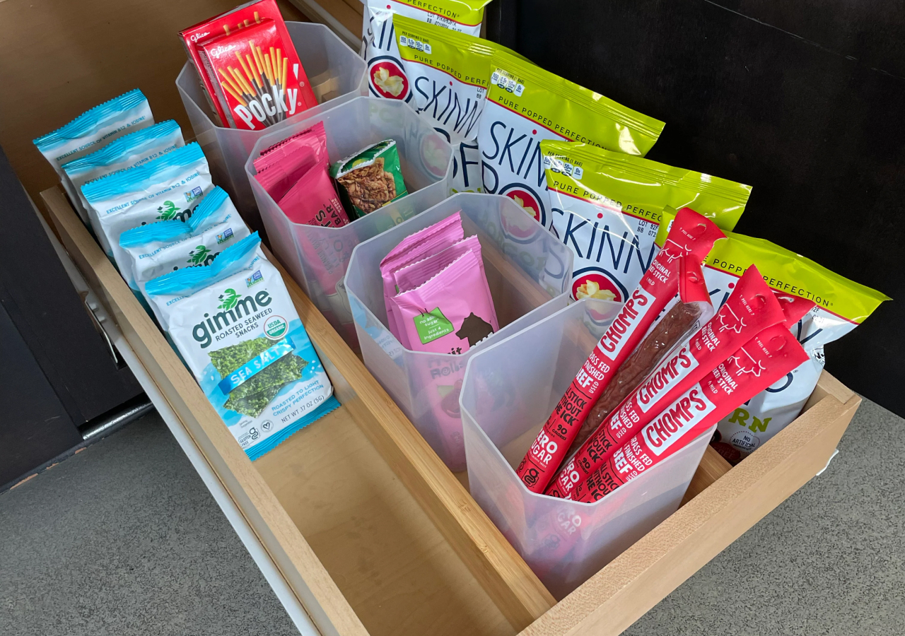 Create a dedicated snack drawer or pull-out in the lower base cabinet near the refrigerator. Keep it simple and consistent: snacks, fruit pouches, or grab-and-go items. This reduces traffic into the prep zone and cuts down on kids asking for help every five minutes.