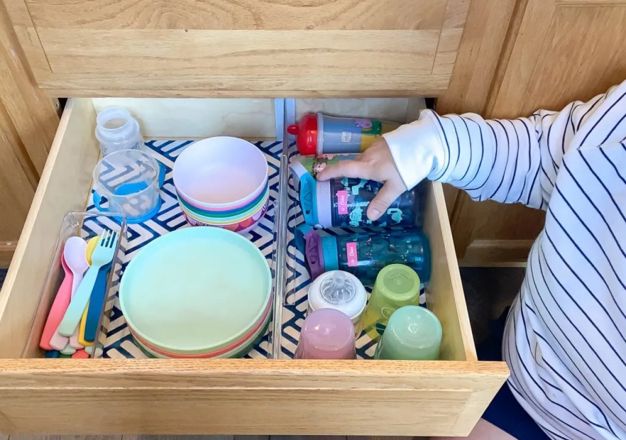 Give kids their own drawer or low cabinet for everyday cups, plates, and bowls. This encourages independence, reduces climbing, and keeps the dishwashing zone from getting overwhelmed because items return to the right place faster.