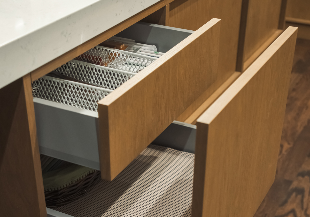 Inner drawers (hidden drawers) increase capacity while keeping the exterior calm. They’re especially useful in high-use zones, like under-cooktop storage for tools and utensil, because you get fast access without breaking the cabinet grid with extra exterior lines.