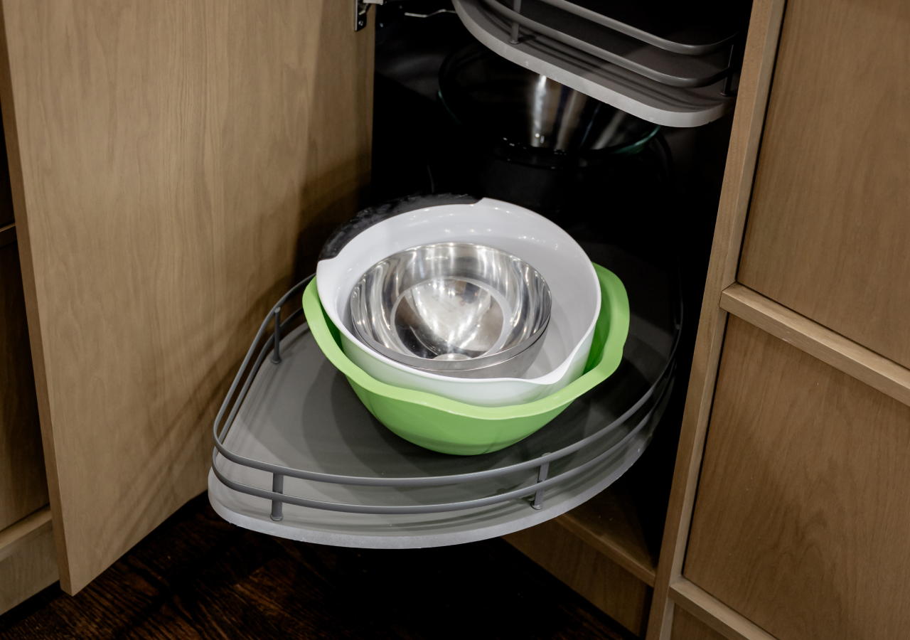 Corners are where kitchens lose function unless you plan for them. Corner drawers and purpose-built corner systems convert awkward volume into usable storage, especially for larger items you don’t want to stack. The right solution depends on behavior: if you never want to kneel and reach, choose a system that brings items toward you.