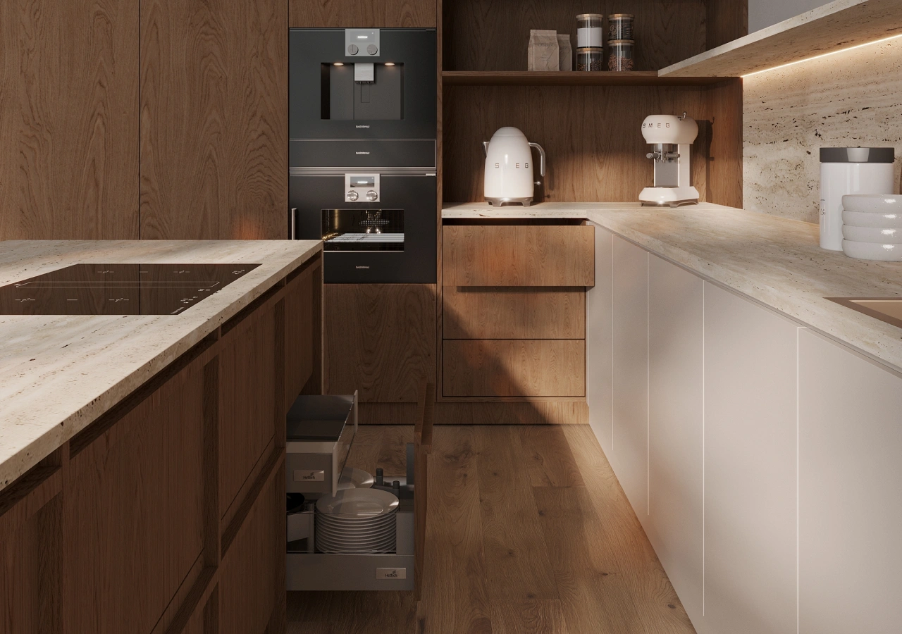 A Scandinavian kitchen island prioritizes visual calm, natural materials, and high storage capture. That usually means fewer decorative details, a controlled palette (often light wood + soft matte finishes), and an interior layout that does the heavy lifting through deep drawers, waste pull-outs, and appliance parking.