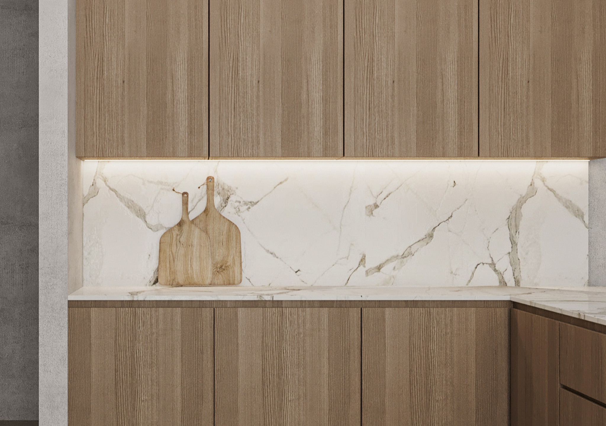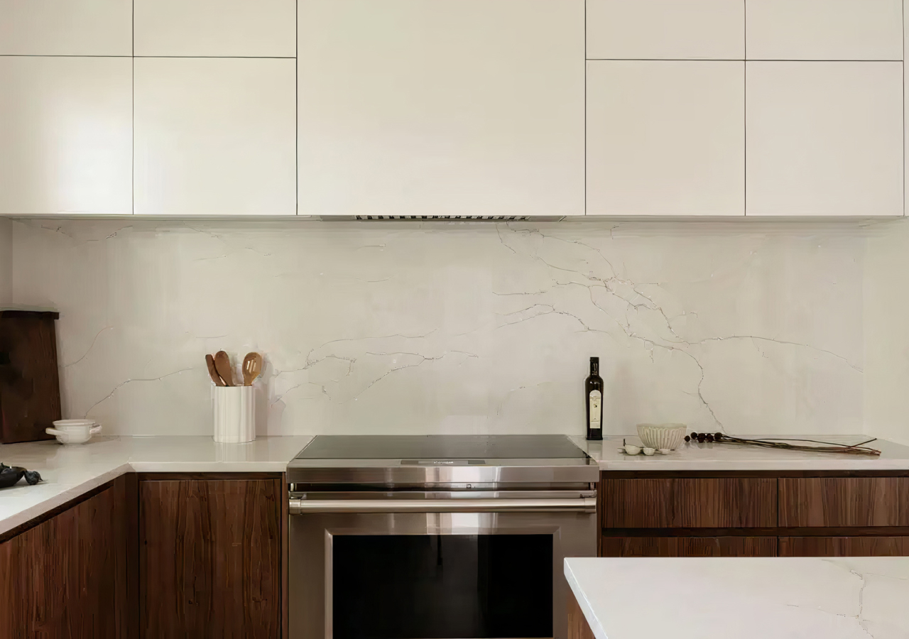 If the countertop is more restrained, the backsplash can carry a bit more presence through texture, finish, or shape. One of the cleanest solutions is using the same material for both countertop and backsplash. This reduces visual breaks and creates a more continuous wall surface.
