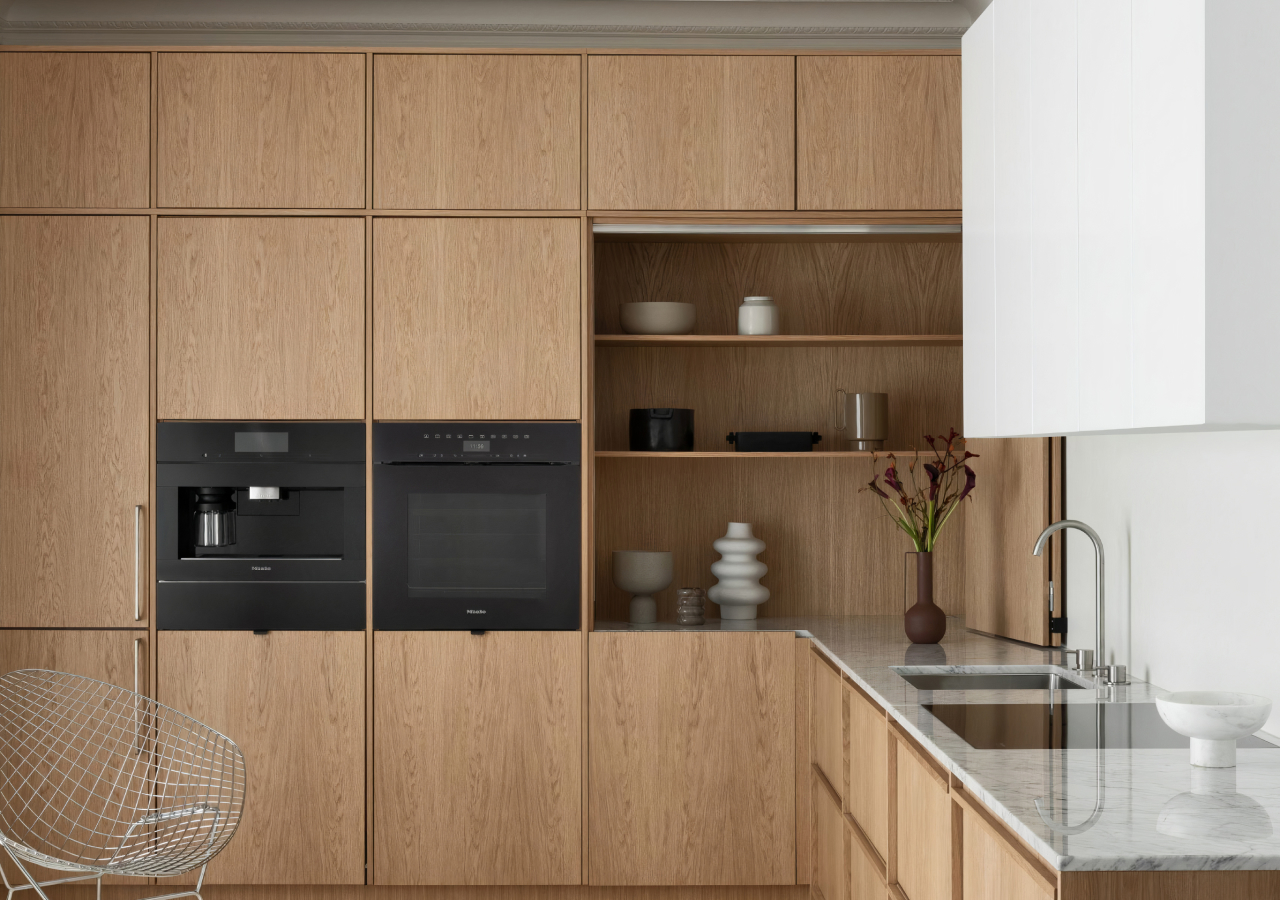 Smart storage plays a key role in creating an ergonomic kitchen. With a custom layout, you can make full use of every inch, including awkward corners, while keeping everything within easy reach. Built-in systems such as carousels, corner pull-outs, drawer dividers, hooks, stands, and pull-out pantries help organize your essentials and improve accessibility.