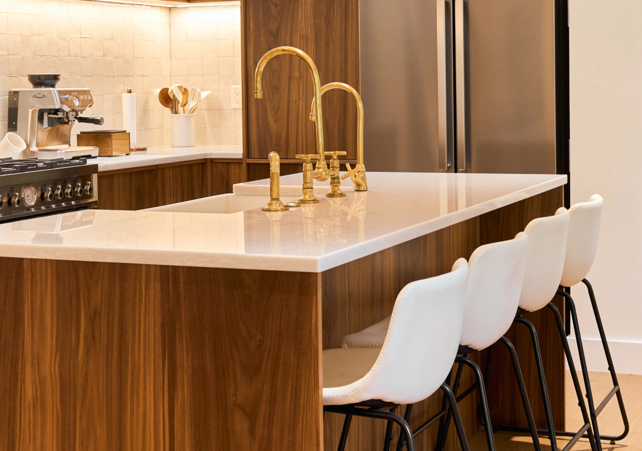 When the kitchen island doubles as a dining area, it needs to feel more like a built-in table than a pure prep block. The footprint usually grows a little longer to seat three or four people in a row or on two adjacent sides. Some homeowners prefer a single height at standard counter level; others opt for a raised bar-height section that gently separates cooking from eating. In Japandi and Scandinavian interiors, softened edges and table-like legs at the seating end help the island feel lighter and more furniture-like while still following the same spacing rules.