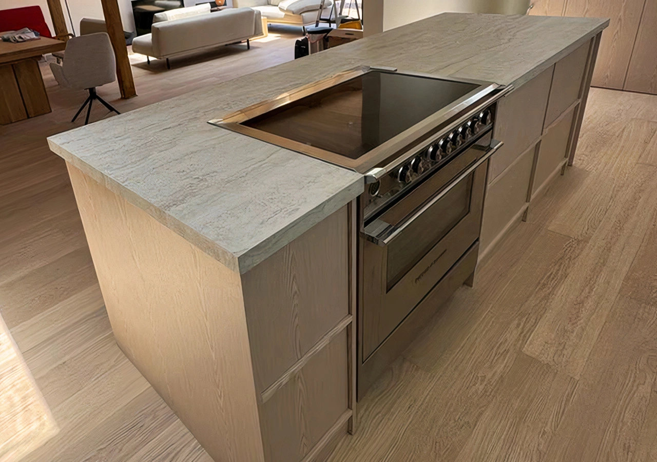 For many modern European kitchens, a depth of around 90 cm works well. This gives space for full-extension drawers, comfortable prep zones, and, if needed, a shallow overhang for stools. Going much deeper starts to make the centre harder to reach, which is why Corner’s projects tend to favour compact depths with smarter internal storage rather than massive slabs of stone.