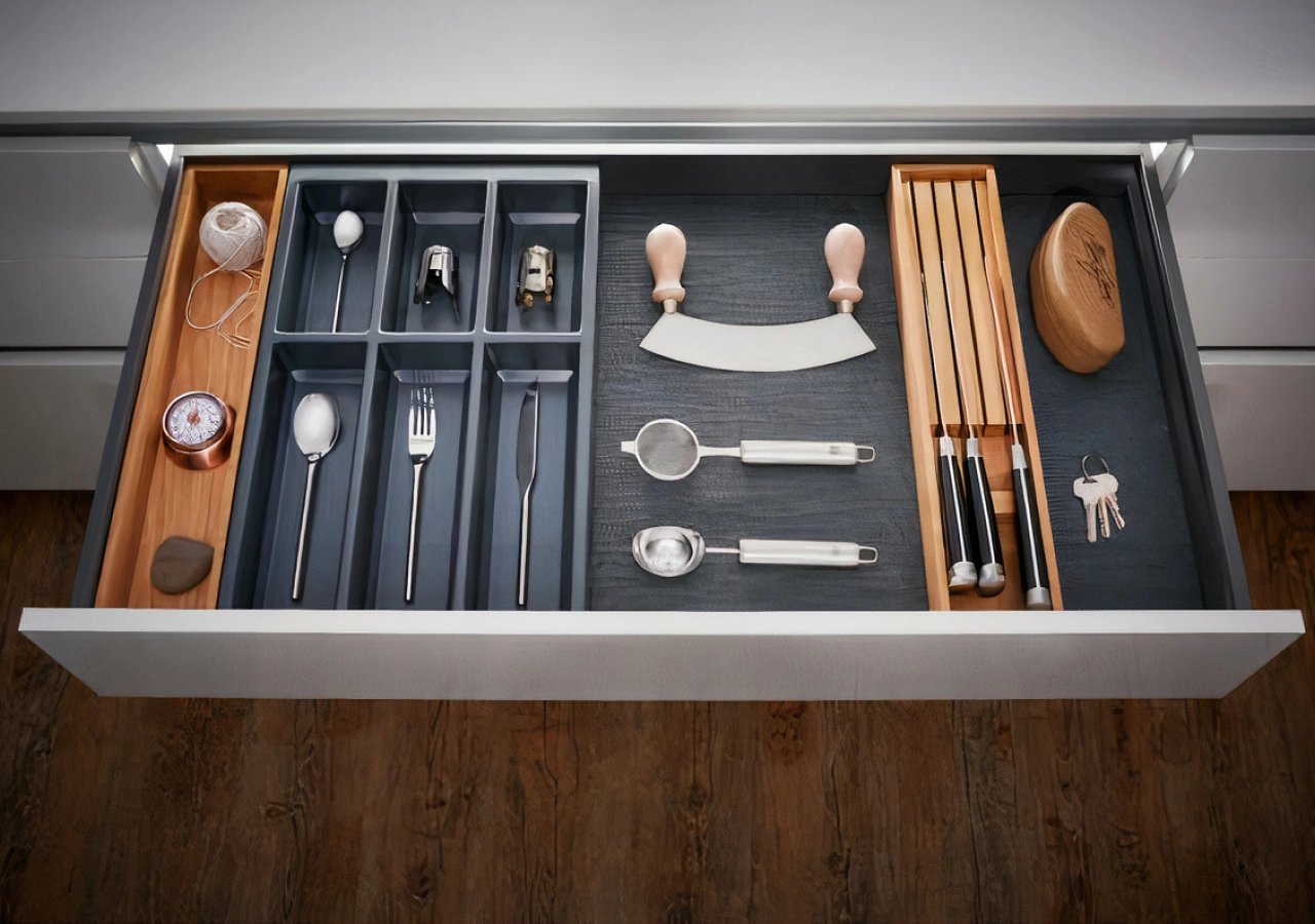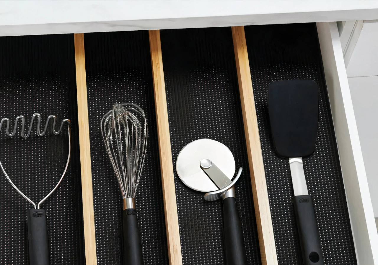 Cooking tools are heavier and more irregular than cutlery, so they slide more dramatically. A grippy liner helps tools stay in their intended zones and softens the sound of metal pieces. It also protects the drawer base from scratches caused by fast, repeated daily use.