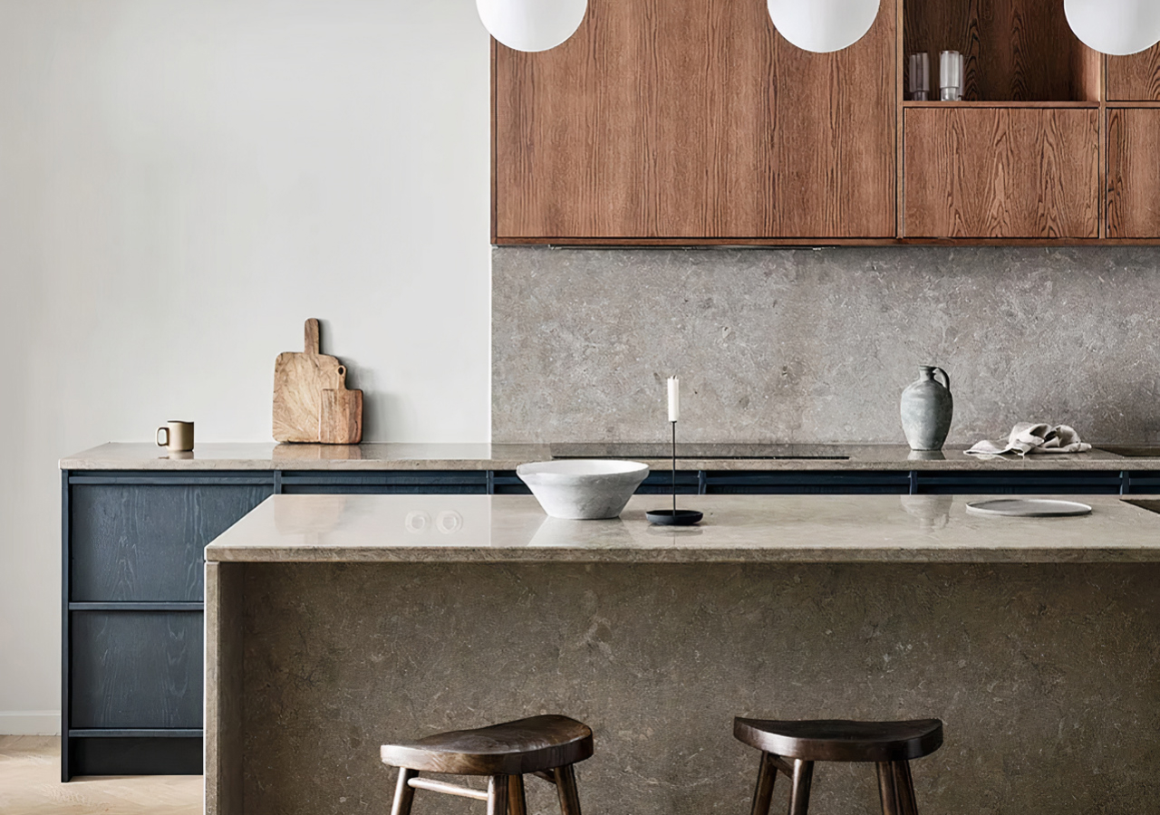 Stone, quartz, ceramic, and matte composite surfaces also fit well, especially when the pattern is quiet. The aim is not to make the kitchen feel rustic. It is to keep the materials natural and controlled.