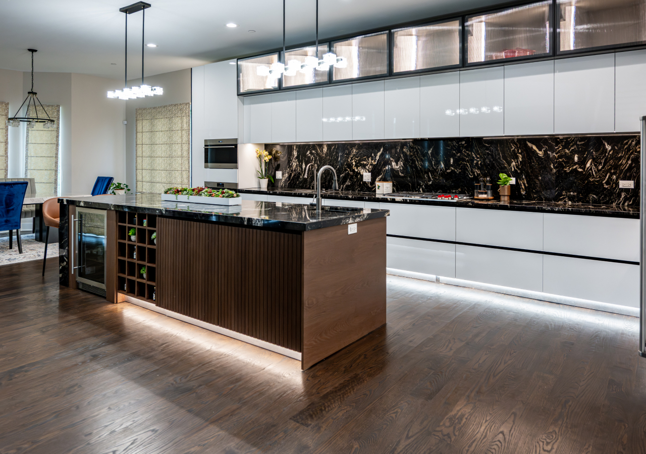 An open layout kitchen makes it easier to create a cohesive interior with uniform flooring, thoughtful lighting, and color schemes. It allows you to visually expand the space by combining functional areas and provides flexibility in the placement of furniture and appliances.