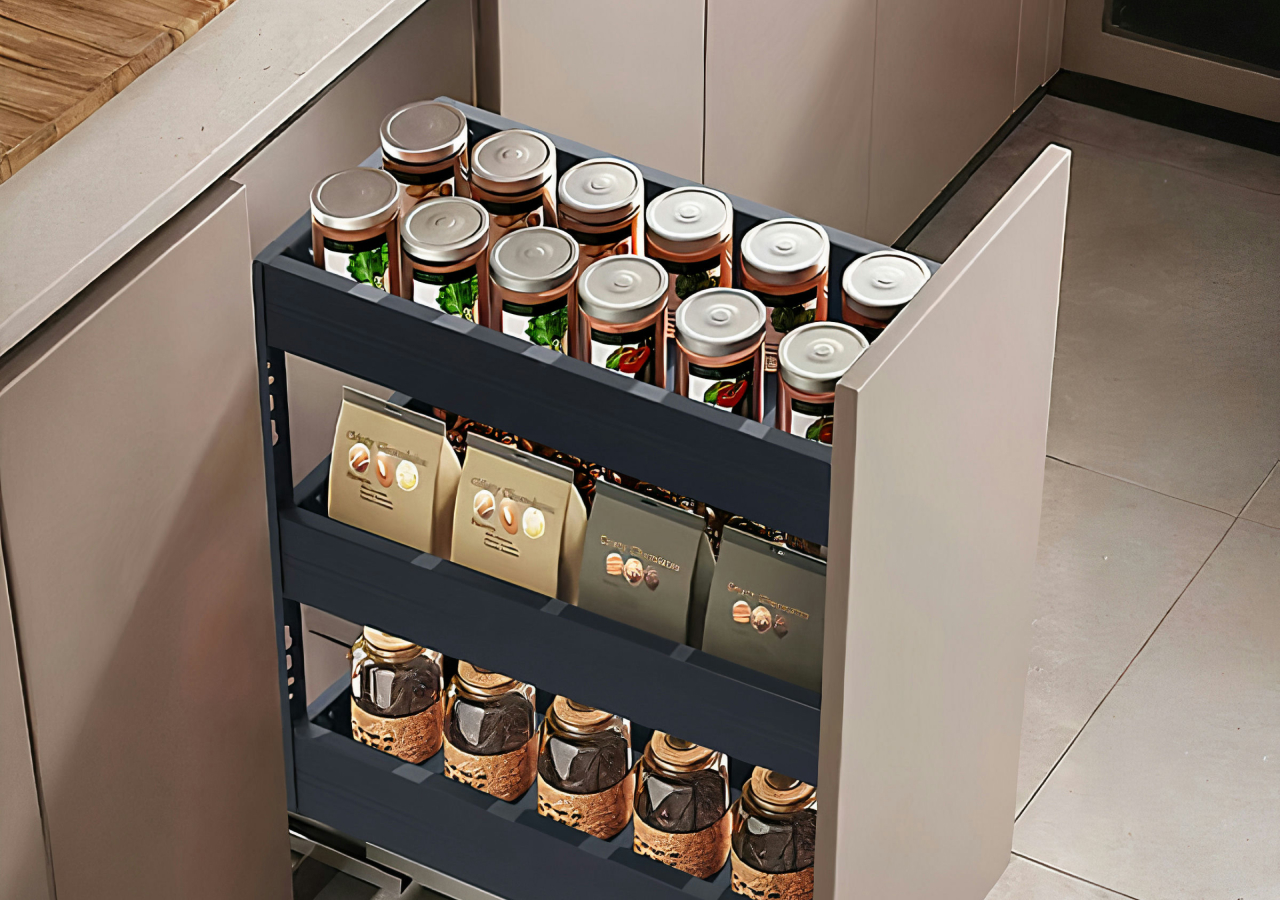 A pull-out spice rack is a slim vertical drawer, typically around 9 inches wide, designed to store spices, oils, and small cooking essentials neatly and accessibly. It slides forward on rails, bringing all jars into view at once, no more rummaging through crowded shelves.