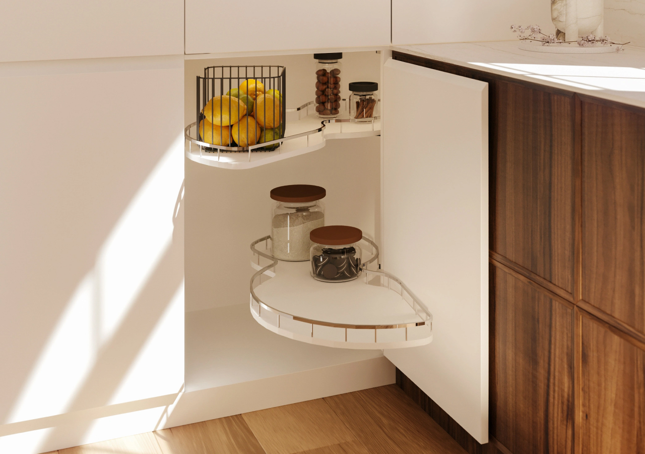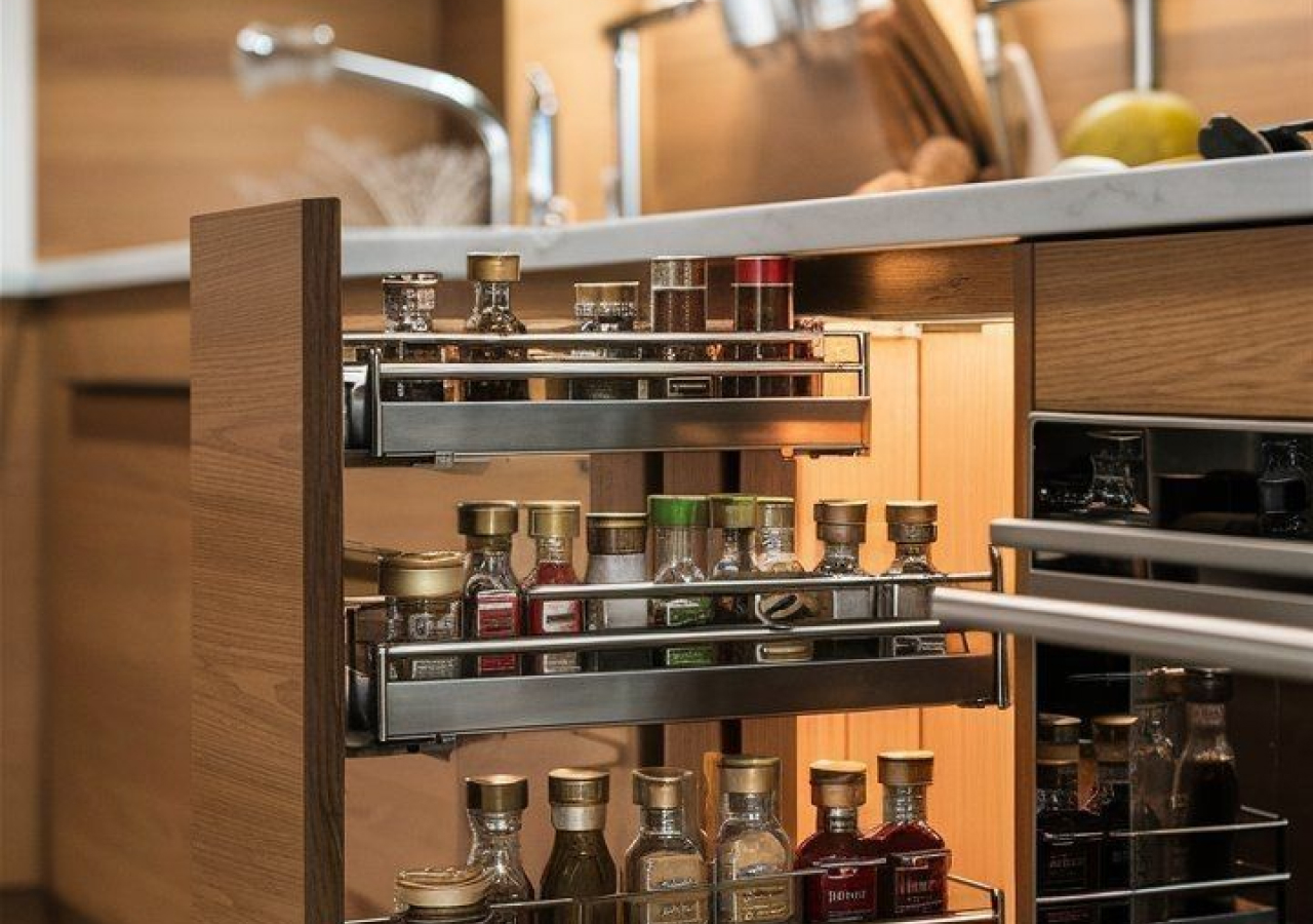For kitchens with corner cabinets, pull-out corner racks are ideal, as they make effective use of the corner and provide easy access to spices without having to pull everything out of the cabinet. This type of shelf is designed to maximize the use of hard-to-reach corners in the kitchen.
