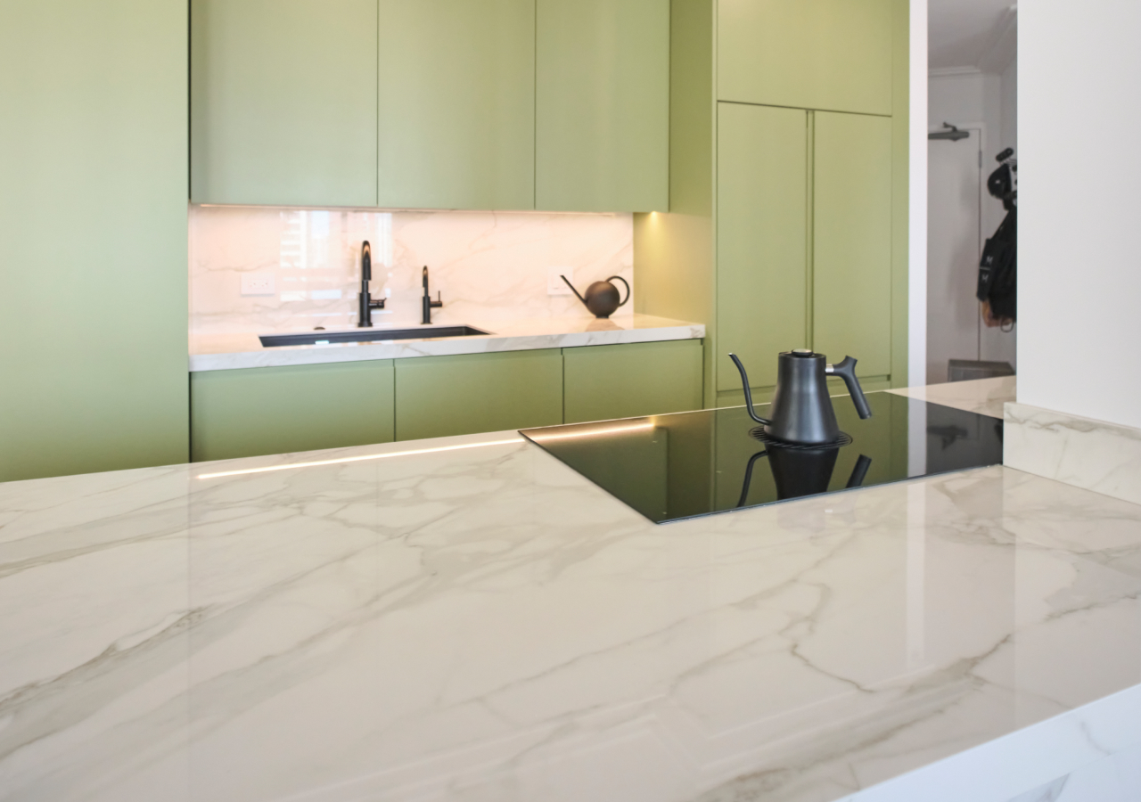 Quartz has a lot going for it: it is durable in normal use, highly stain resistant, and it does not require sealing. That makes it one of the best materials for homeowners who want a clean-looking kitchen without a complicated maintenance routine. It is also highly flexible aesthetically, ranging from quiet, warm minimalist looks to bolder veined patterns that mimic marble.