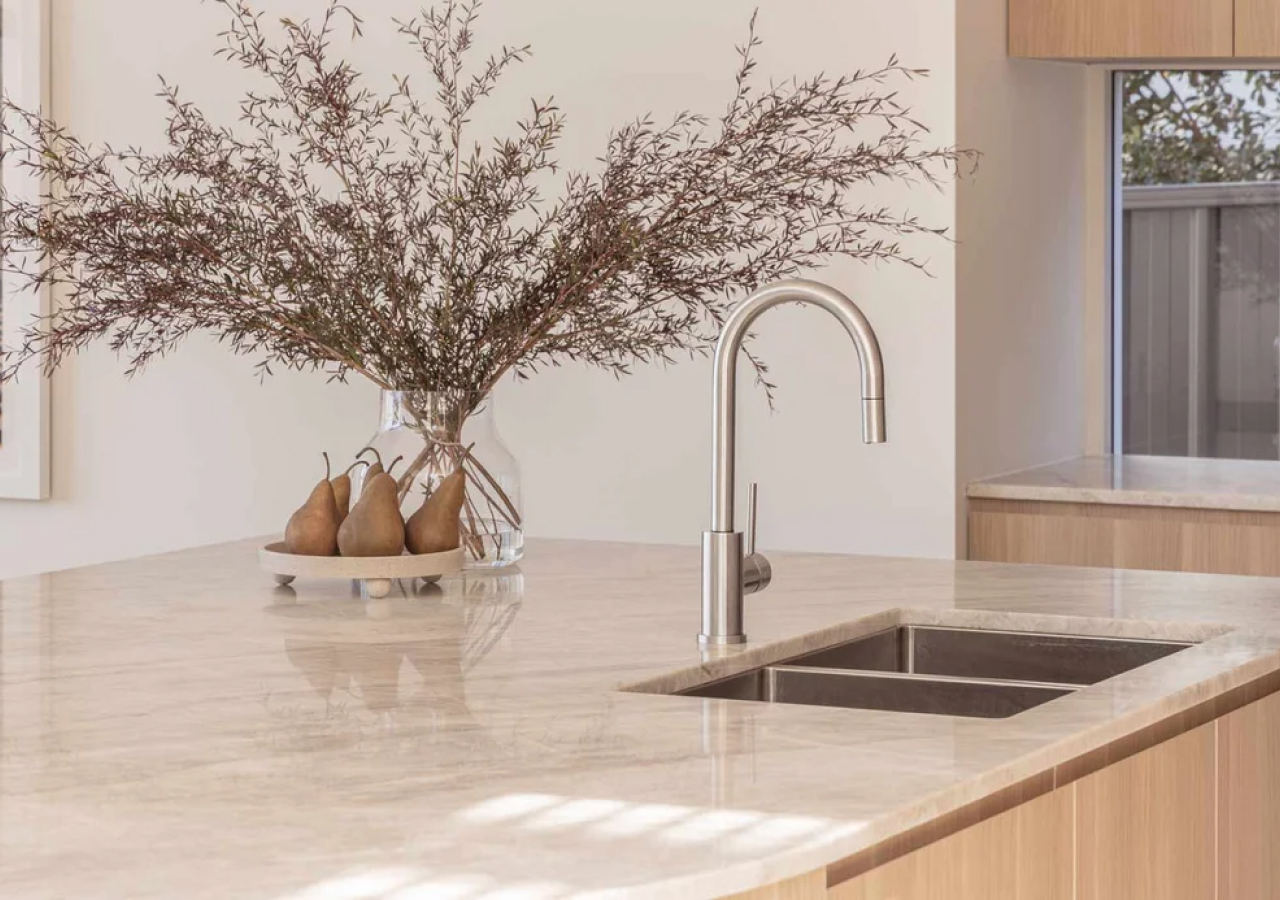 A Scandinavian kitchen countertop is typically pale, matte, and low-contrast in pattern so it feels calm even on busy days. In Scandinavian kitchens, countertops often use quartz and Dekton because they offer quiet tones—warm whites, soft beiges, taupes, greiges, and light grays—with just enough movement to keep the surface interesting without overpowering the composition. Natural stone like honed marble or quartzite can also fit beautifully, as long as the veining is quiet and the finish is soft.