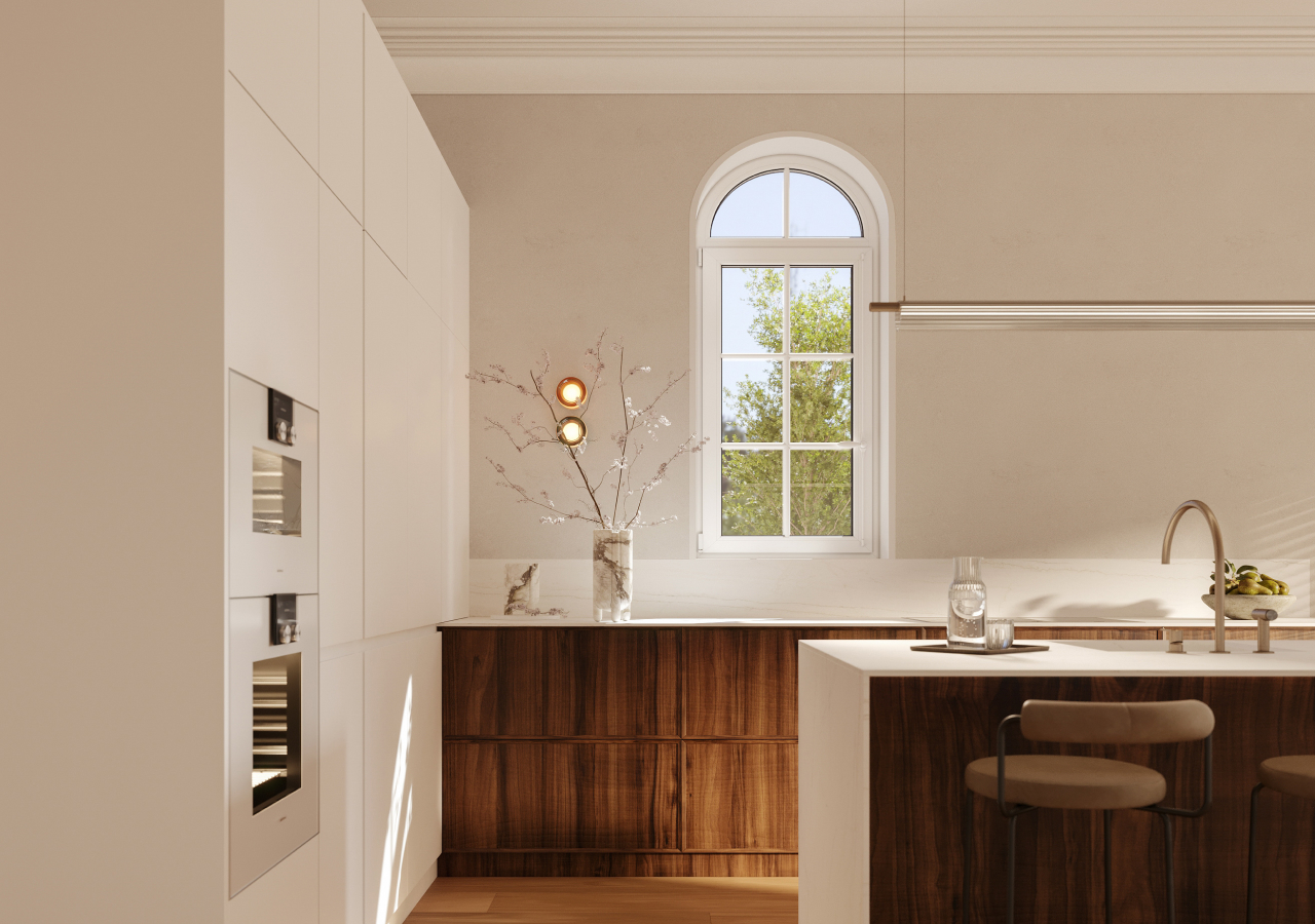 The finish choice does a lot of the work here. Fenix is positioned as matte, soft-touch, and anti-fingerprint, which aligns with the broader Scandinavian preference for low-reflection surfaces that don’t look shiny or smudgy. The pantry functions as a “calm keeper,” combining built-in appliances, an appliance garage, and shelves plus drawers that keep daily objects from migrating onto the countertop. Even the island earns its footprint by carrying real storage, which supports the uncluttered look in everyday use.