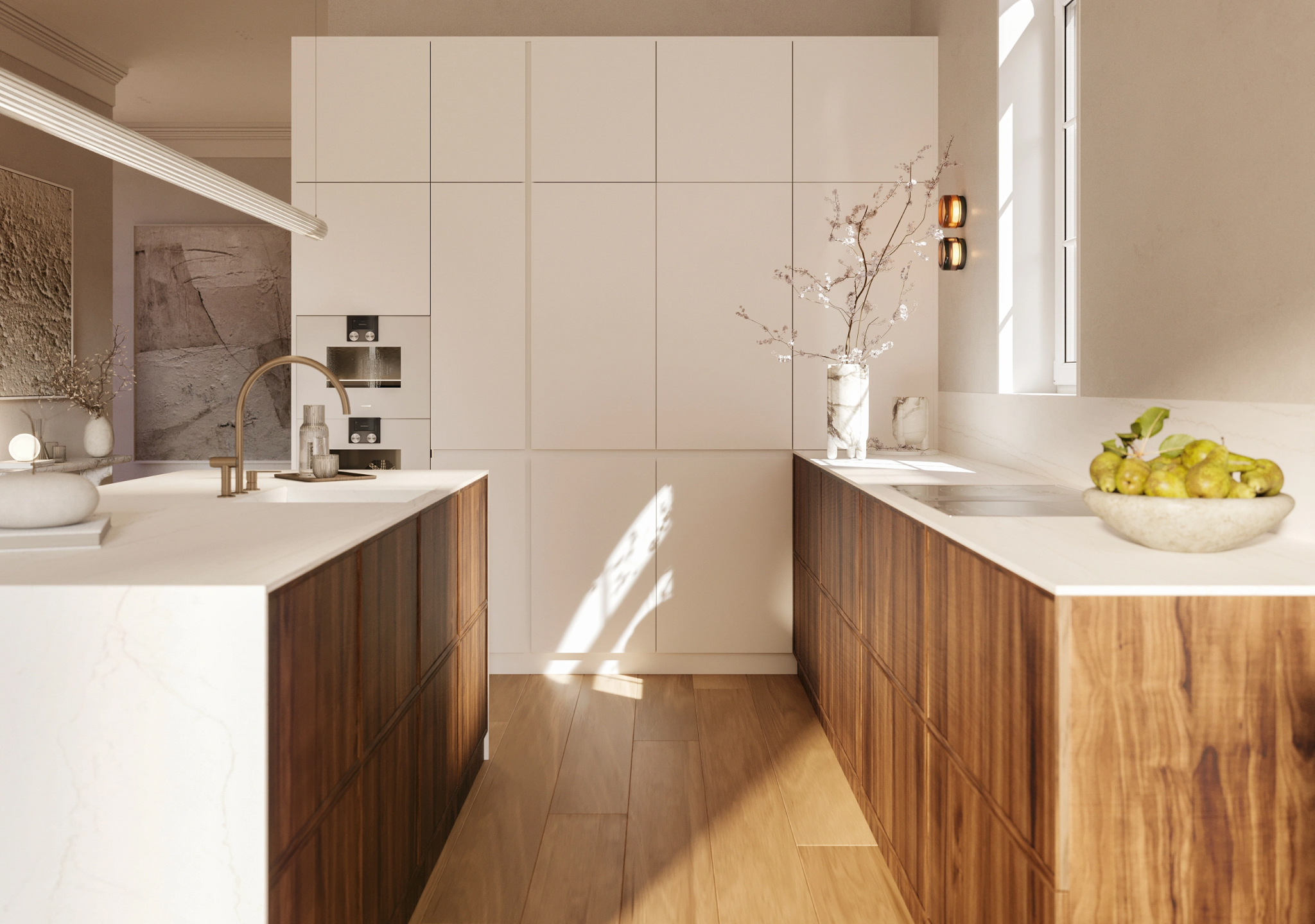 In small open plans, an L-shape can feel more social and less hallway-like than a galley. The key European move is to treat the corner as real storage, not dead space. A proper corner pull-out system turns the corner into one of the highest-capacity cabinets in the room, which is exactly what small kitchens need.