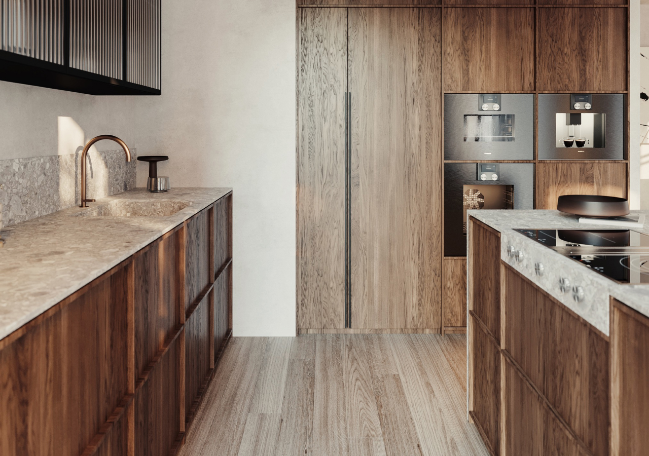 For studios and very compact footprints, a one-wall kitchen can still feel “European” if you treat it as a composed elevation: tall storage + a base run + a slim upper band (or a short shelf zone) that stays visually quiet. The benefit is simplicity. The risk is the “clutter wall” problem, where everything ends up on the counter because storage is too shallow or too vague.