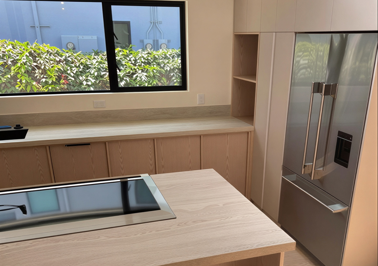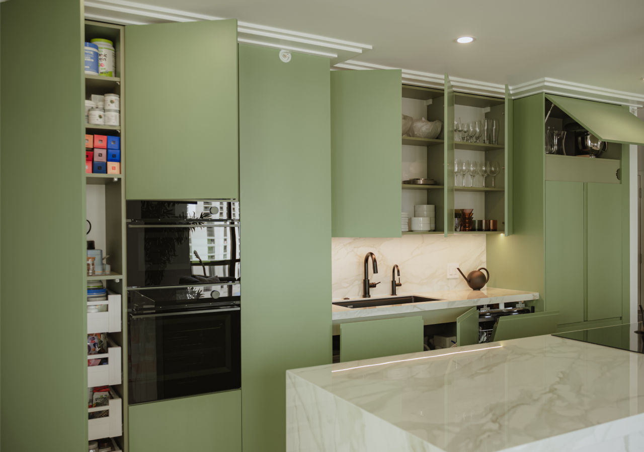 The sink zone is where small kitchens fall apart: sponges, cleaners, bins, compost, and backups spill onto counters because the storage is awkward. Under-sink drawers or pull-outs turn that “wasted” cavity into a controlled zone, and adding a pull-out waste setup near prep makes cleanup faster and less messy.