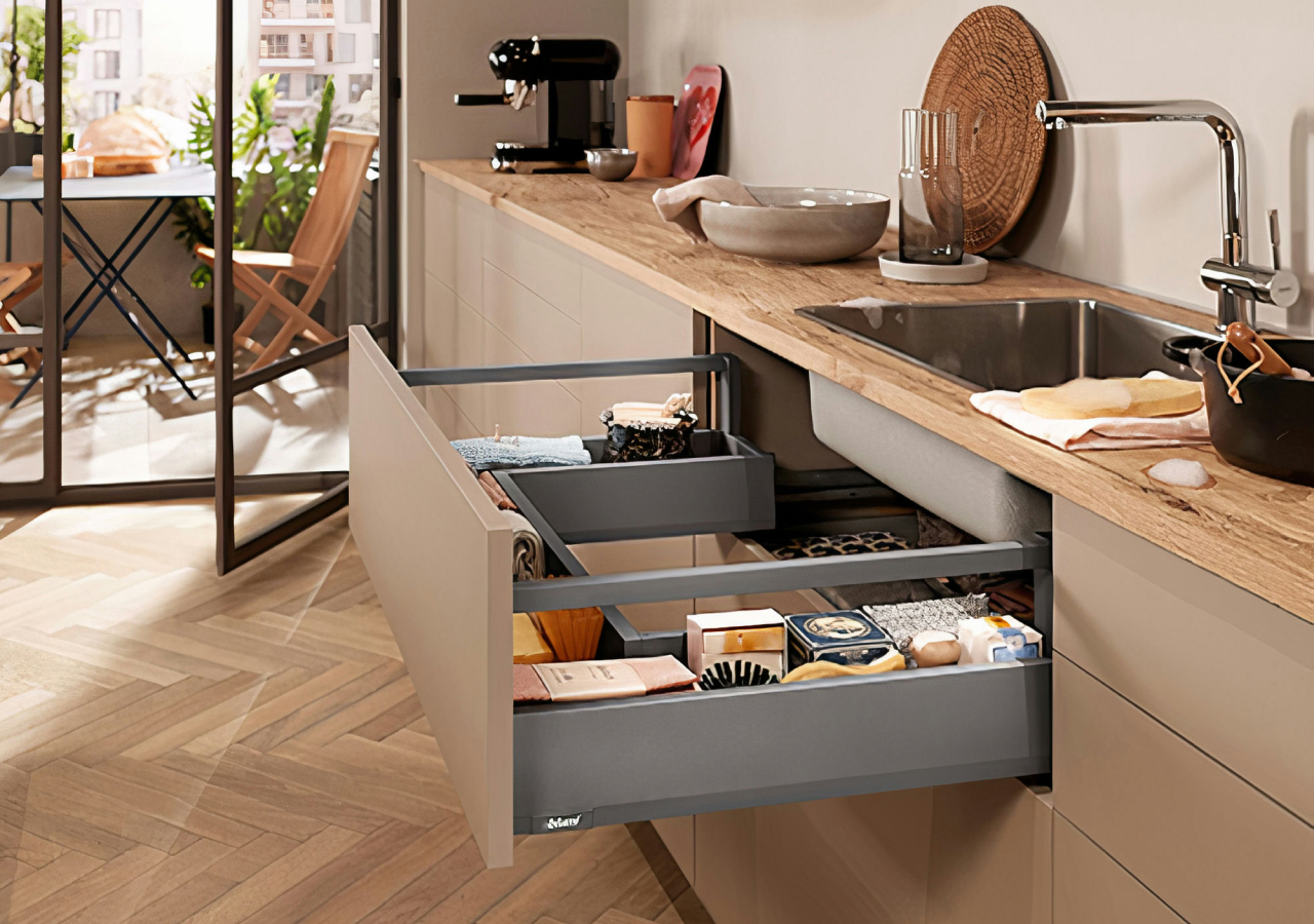 Inner drawers (drawers within drawers) are one of the most effective upgrades for compact kitchens. They create layers without visual noise: a shallow top tier for small daily items, and a deeper tier below for bulkier tools. That keeps categories stable, speeds up cooking, and reduces the mess that spreads onto counters.
