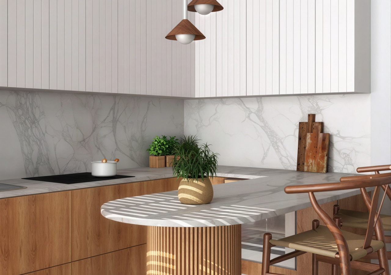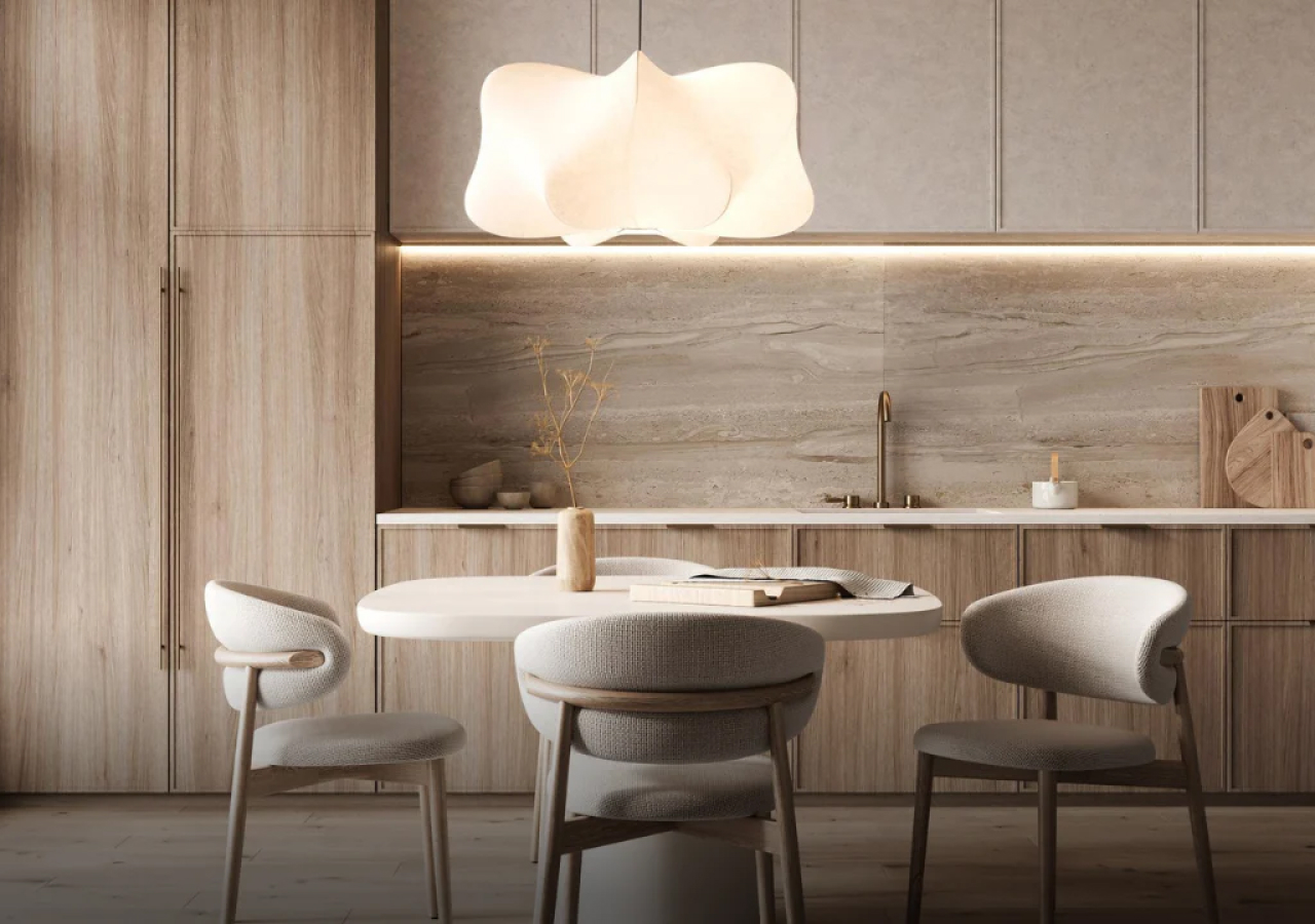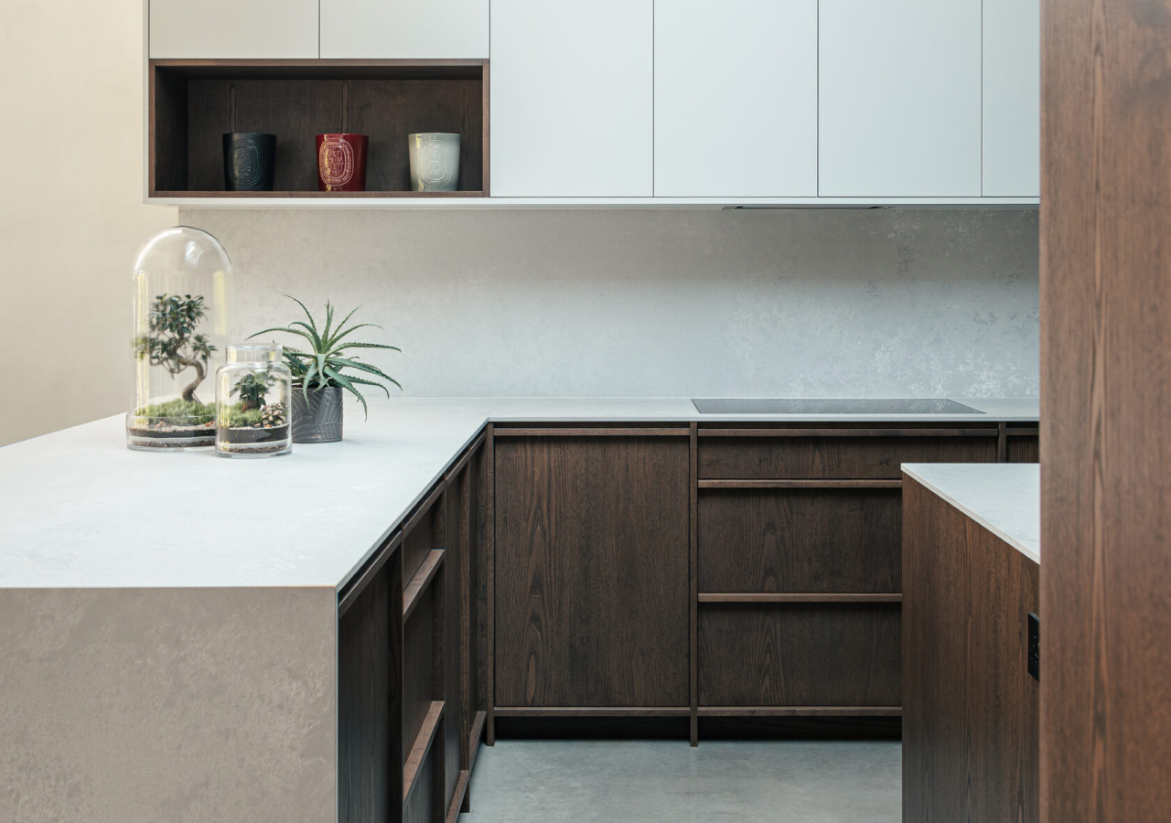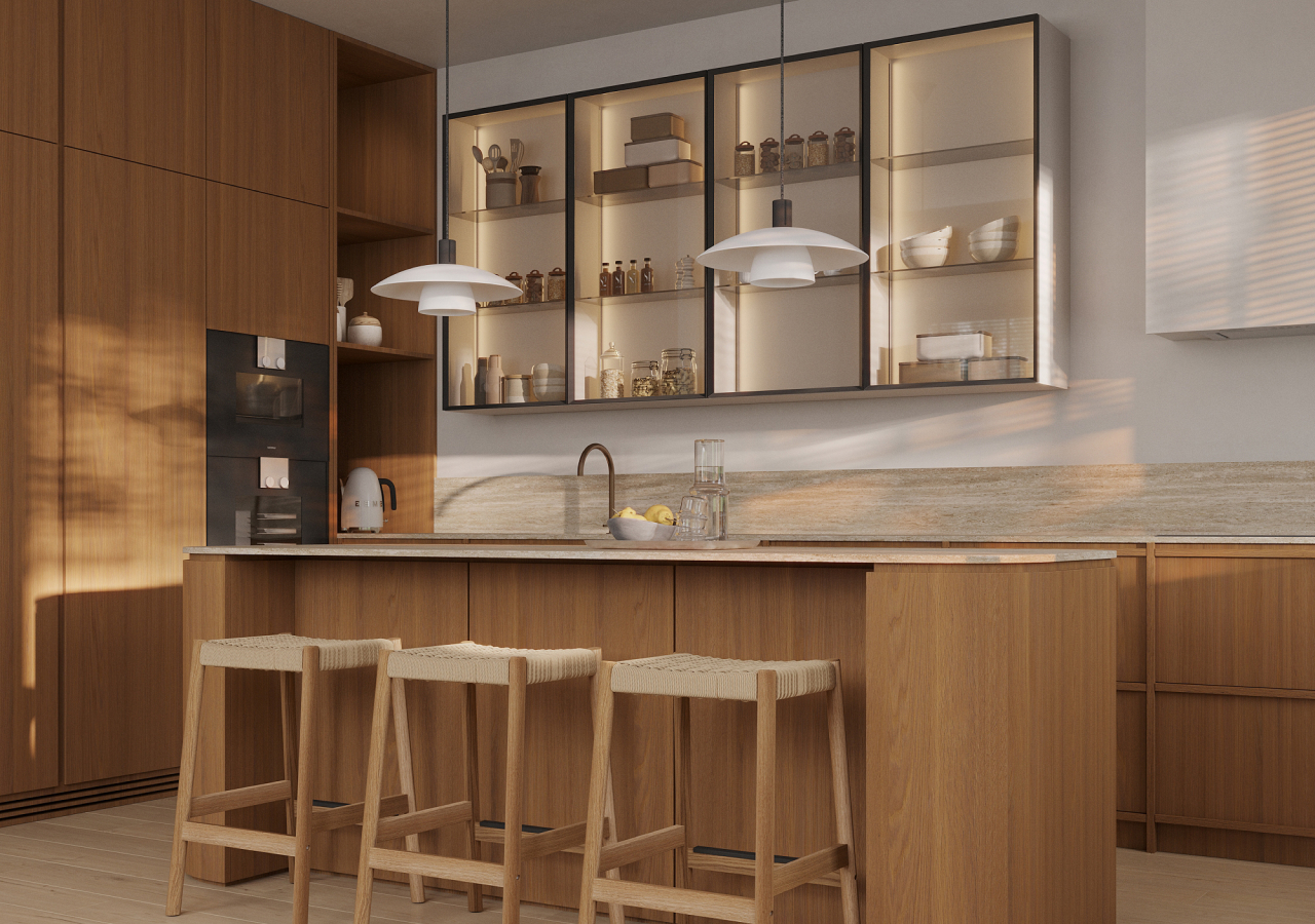 Japandi doesn’t mean sterile. Warm wood, soft matte finishes, and subtle texture keep the room welcoming. When storage is doing its job, styling can stay minimal, and the material choices can carry the atmosphere. That’s what makes the kitchen feel like a calm part of the home rather than a busy workspace.