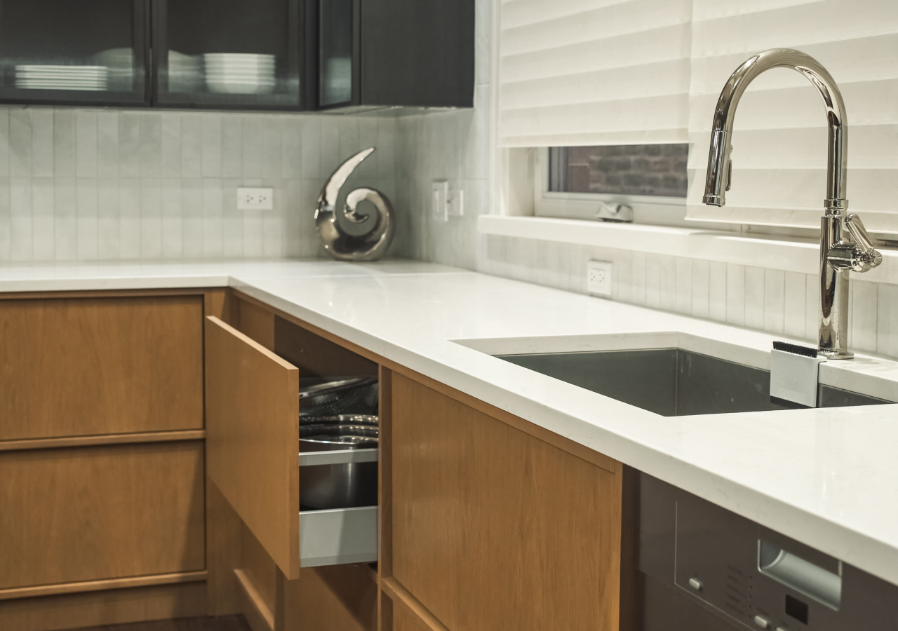 Functionally, under-sink drawers make cleaning supplies easy to grab and easy to put away. Visually, they reduce countertop clutter because sink tools have a contained home.