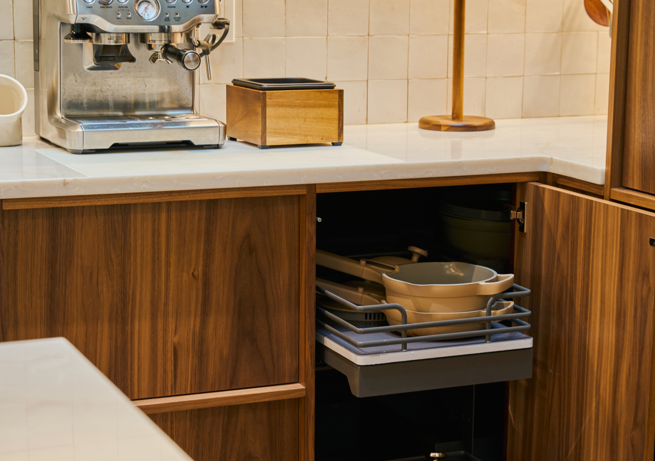 Inner drawers are especially useful near the primary prep zone. They keep small items controlled, so you’re not spreading tools across the counter just to find what you need. The result is functional and visual at the same time: the kitchen works smoothly, and it looks composed even when you’re using it.