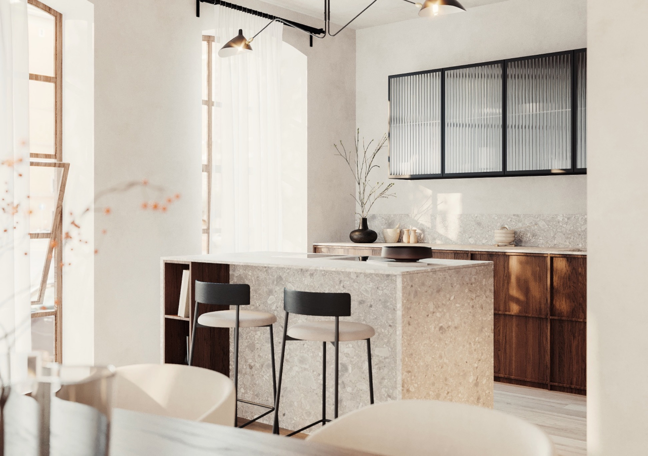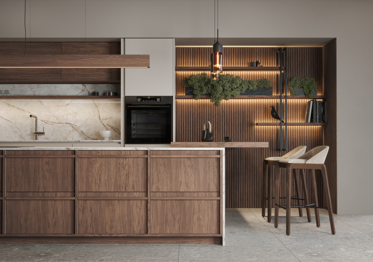 Warm wood, ceramics with a lively texture, stone, and matte surfaces fill the interior with tactility and natural energy. These materials create a balance between strength and softness, giving the kitchen a feeling of comfort and stability.