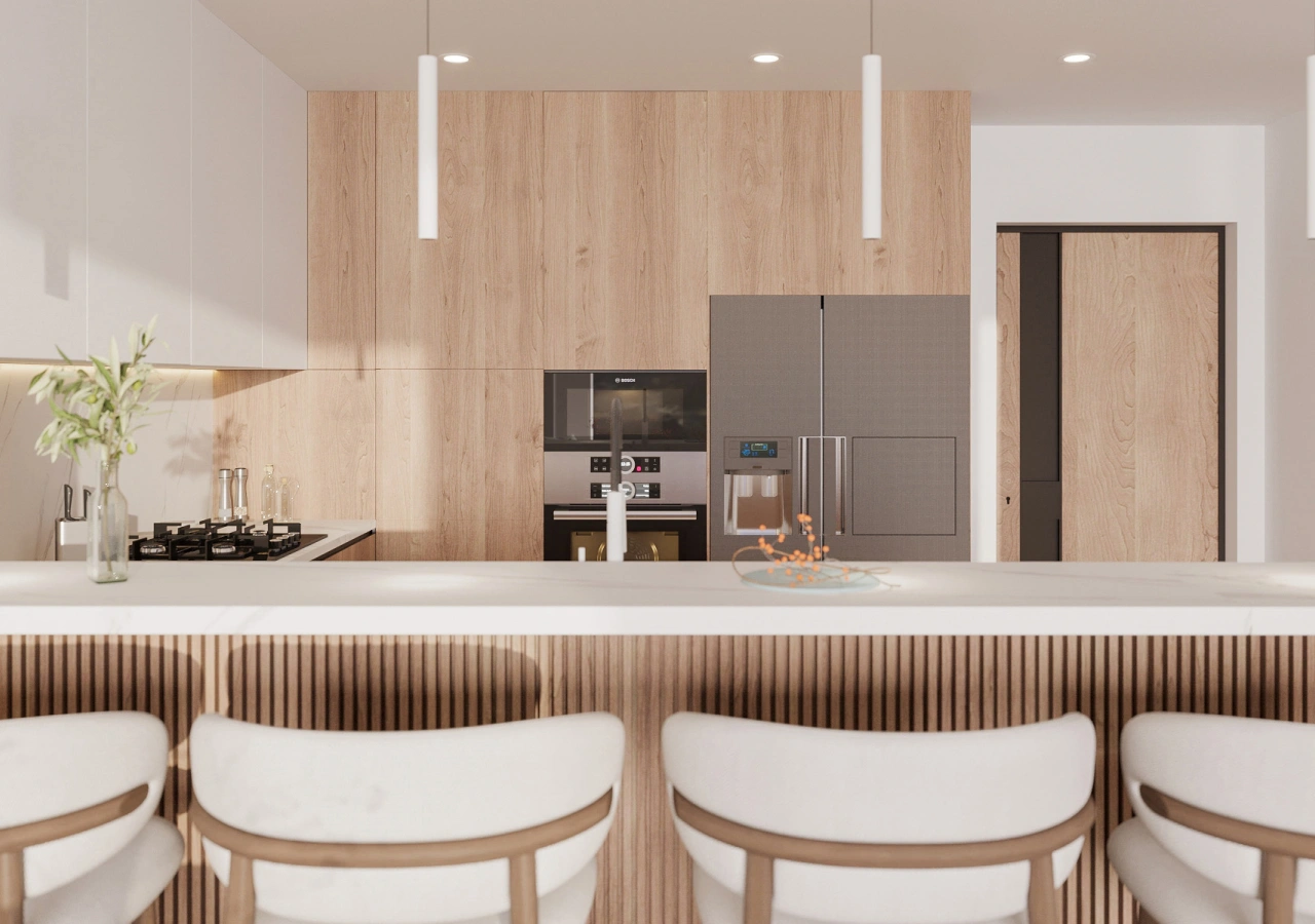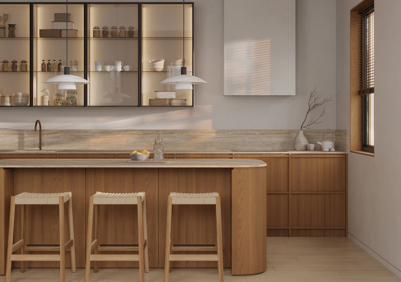 A clean handleless look becomes warmer when the cabinetry includes rounded corners and a curved island profile. This is a strong direction when you want minimalism without sharpness, especially paired with a quiet, stone-like surface and a clutter-hiding appliance plan.